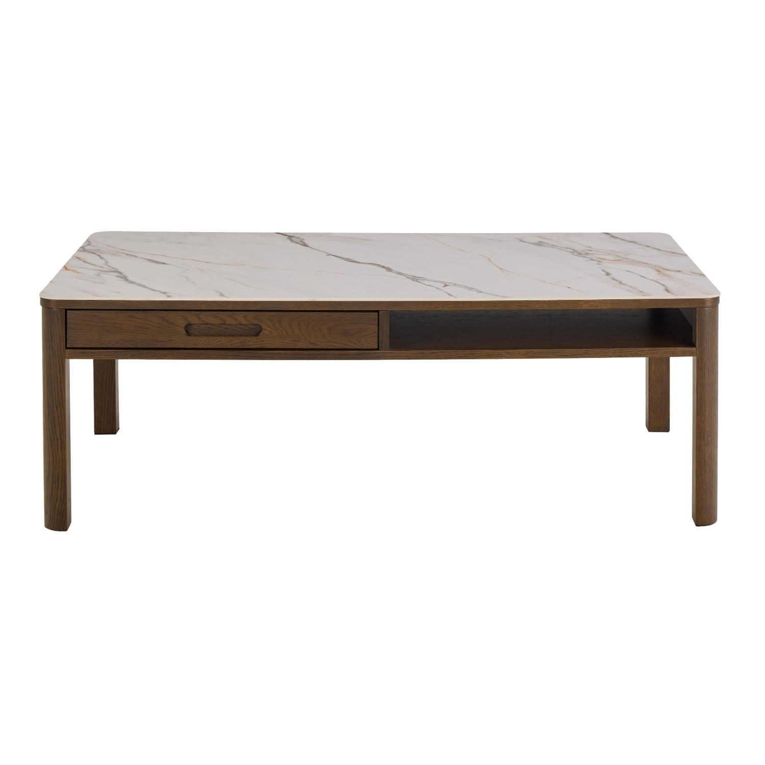 Măsuța de cafea 130 crem/stejar afumat Southampton îmbină eleganța naturală cu durabilitatea și este ideală pentru decorarea unui living modern în care această masă de cafea dreptunghiulară cu blat ceramic crem lustruit și picioare din MDF cu furnir de stejar afumat adaugă rafinament. Nuanța intensă a lemnului și modelele subtile ale ceramicii creează un contrast armonios, oferind o experiență vizuală caldă și sofisticată. Sertarul discret cu mâner decupat asigura spațiu pentru depozitarea lucrurilor mărunte, inclusiv telecomenzi sau încărcătoare de telefon. Designul modern, definit de proporții echilibrate și detalii fine, transformă măsuța de cafea 130 crem/stejar afumat Southampton într-un element central al oricărui living contemporan.