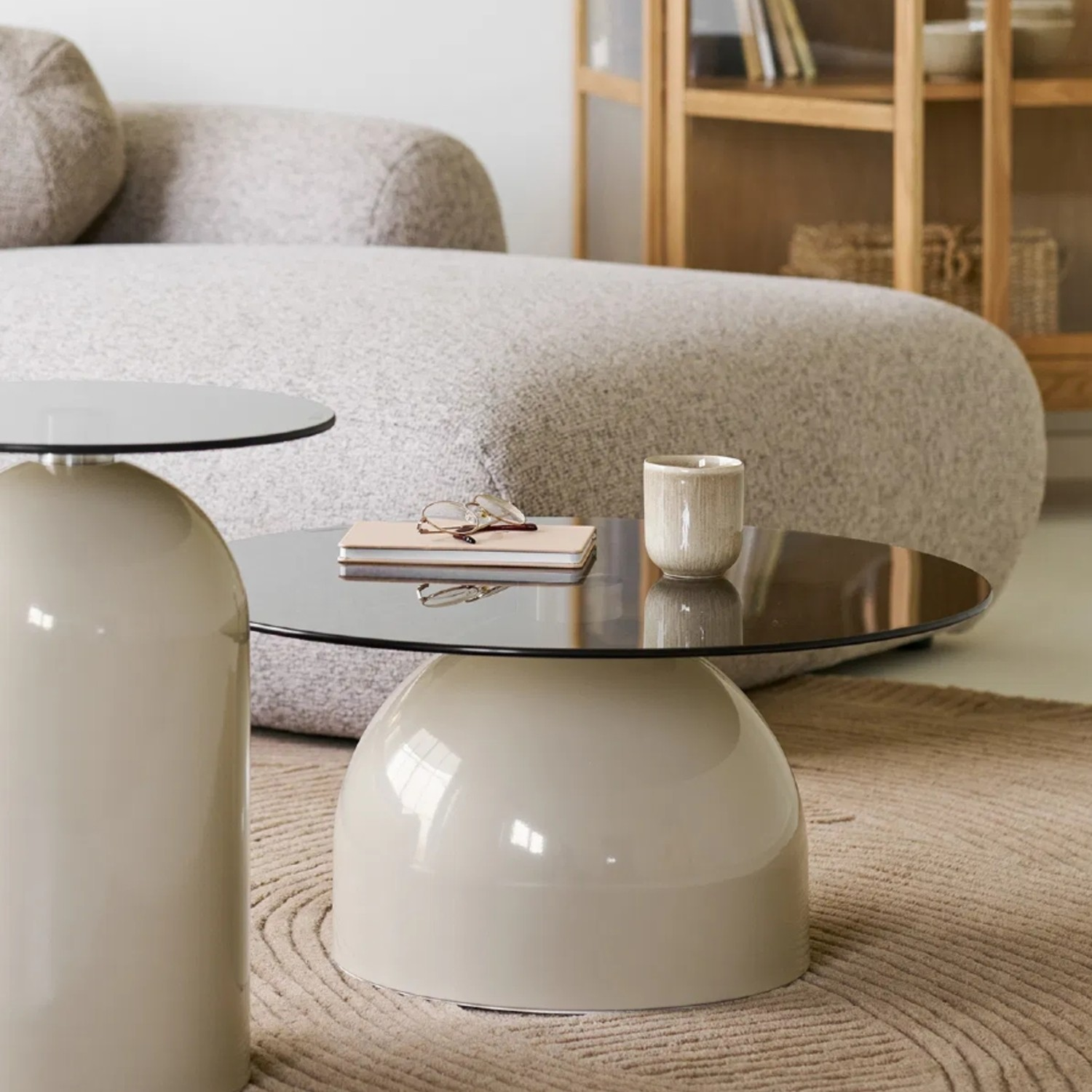 Adaugă un accent sofisticat și contemporan livingului tău cu măsuța de cafea modernă gri bej Ravello realizată cu picior metalic sub formă asemănătoare unui clopot vopsit într-o culoare sofisticată gri bej, ușor de integrat in interioare moderne. Designul său minimalist este evidențiat de piciorul central cilindric, care pe langă aspect, oferă stabilitate. Blatul rotund din sticlă securizată fumurie adaugă o notă glamour acestei mese speciale. Suprafața lucioasă reflectă delicat lumina, punând în valoare nuanța profundă și adăugând profunzime spațiului. Ideală și ca masă de colț, masă pentru lampă sau suport decorativ, această piesă îmbină funcționalitatea cu estetica premium.