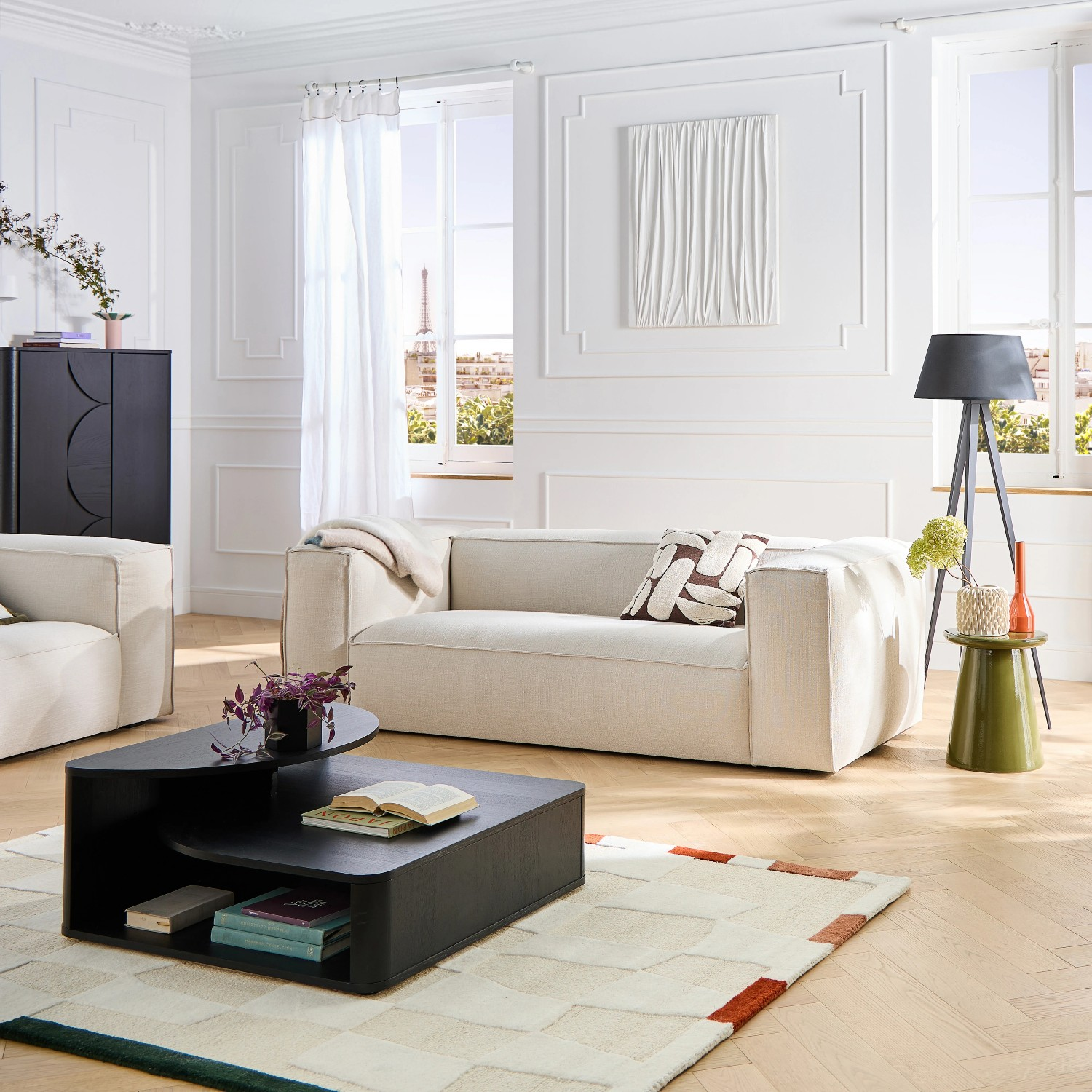 Măsuța de cafea din lemn, negru, Amore îmbină perfect funcționalitatea cu estetica și aduce un plus de rafinament și eleganță în orice living, fiind ideală pentru interioare moderne sau contemporane. Construită din PAL cu furnir natural de frasin, măsuța de cafea din lemn, negru, Amore se remarcă prin durabilitate și rezistență sporită, ceea ce o face potrivită pentru utilizare zilnică, pe termen lung. Finisajul negru premium îi conferă un aspect sofisticat, dar și versatilitate, fiind ușor de integrat în diverse stiluri de amenajare. Blatul superior cu margini rotunjite adaugă delicatețe și un aer sofisticat, oferind în același timp un spațiu generos pentru cești de cafea, reviste sau obiecte decorative. Detaliile minimaliste și forma sa curbată transformă măsuța de cafea din lemn, negru, Amore într-o piesă de mobilier elegantă, dar și practică, perfectă pentru momentele de relaxare alături de familie și prieteni.