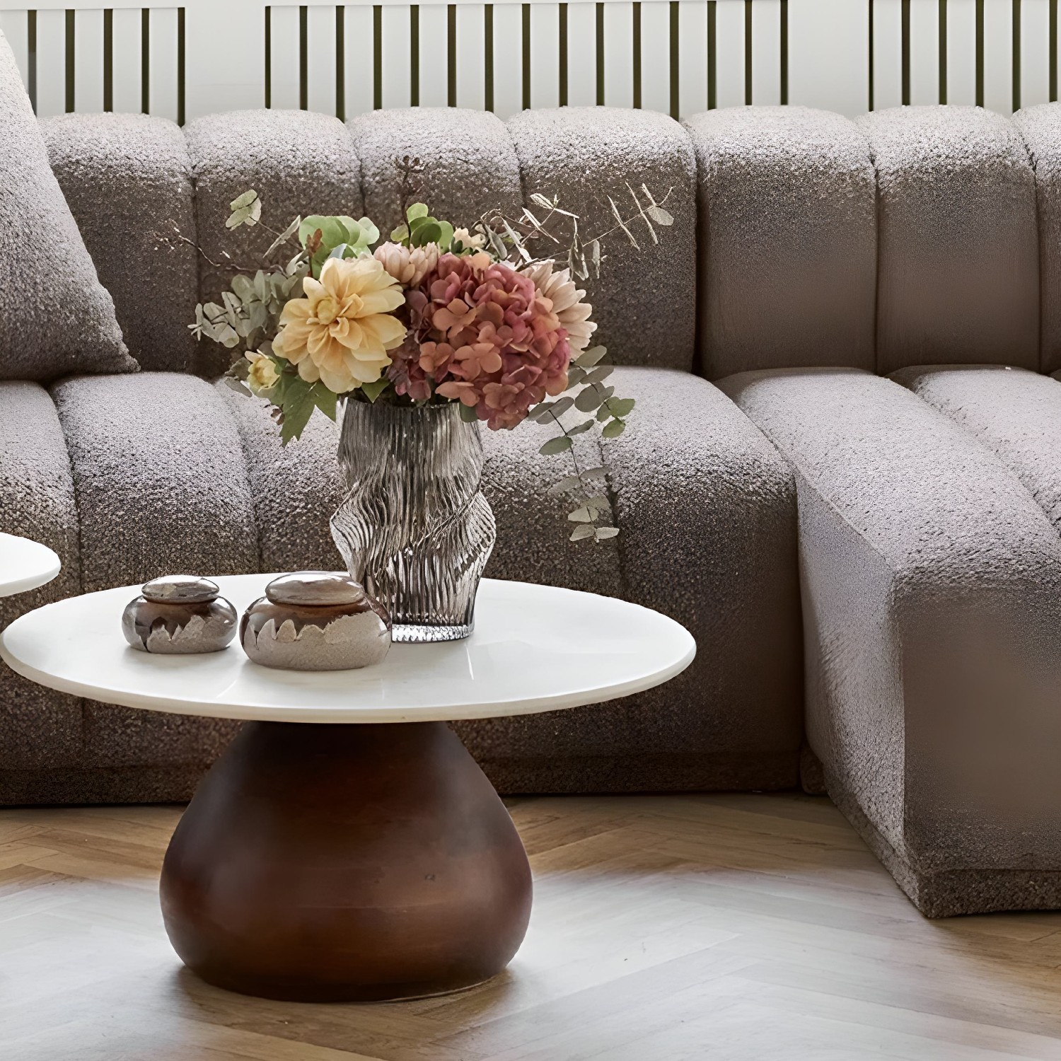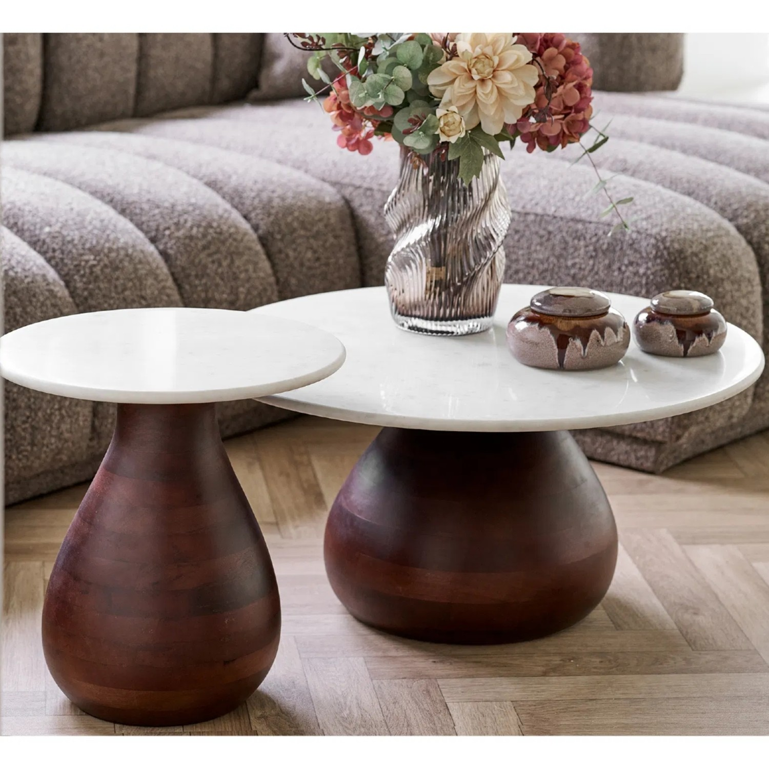 Blatul din marmură albă naturală adaugă un contrast sofisticat și luminos, transformând masa de cafea într-un element central de decor. Combinația dintre lemnul exotic și piatra naturală creează un echilibru perfect între naturalețe, durabilitate și rafinament.