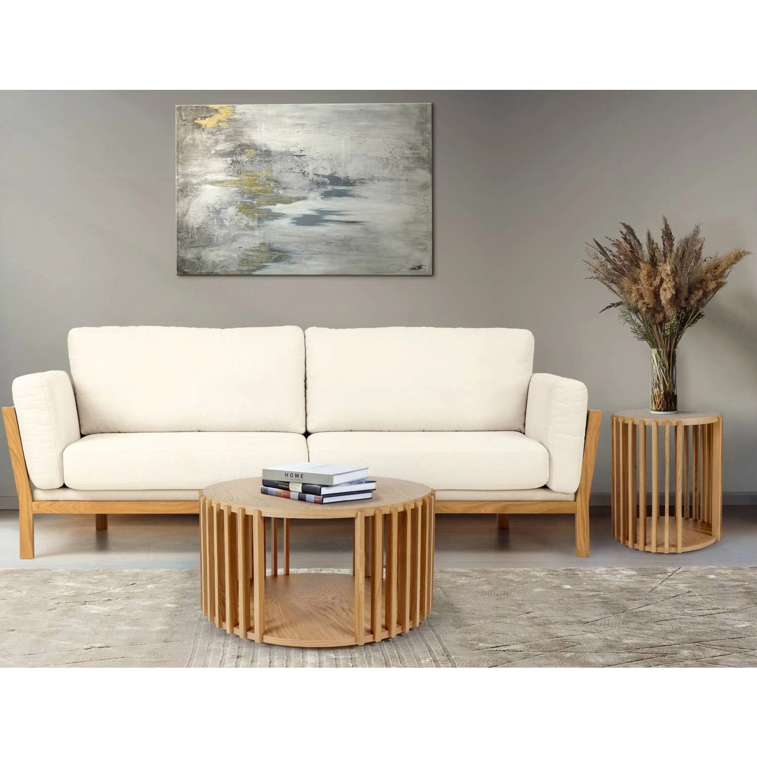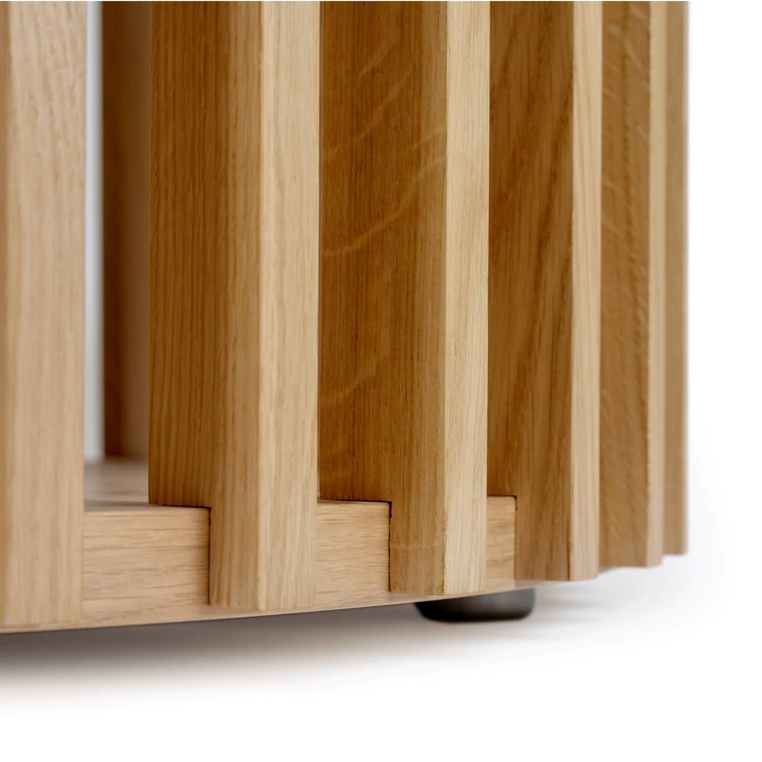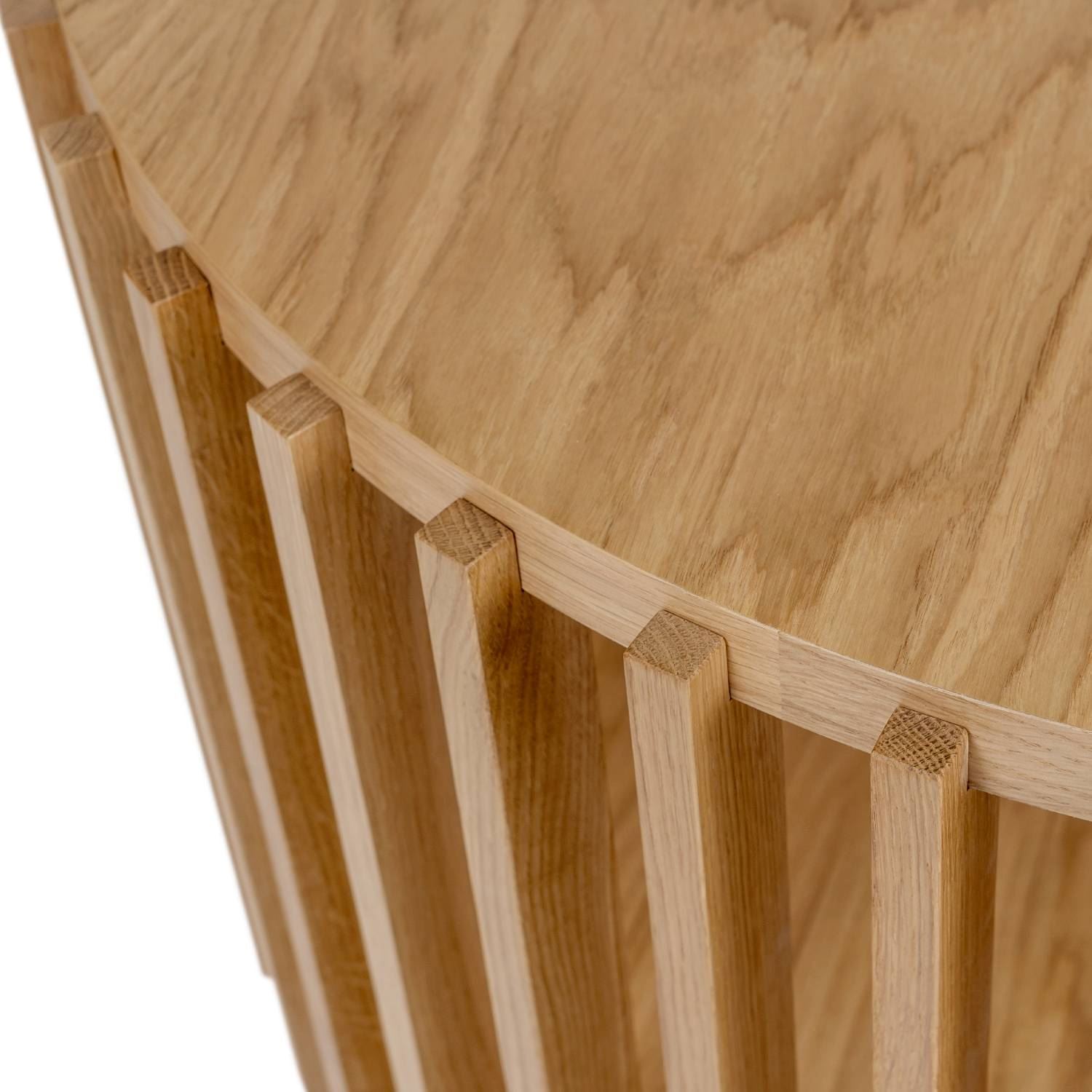 Masuta de cafea din stejar, finisaj natur, Round poate fi piesa de accent din livingul dumneavoastra datorita designului special care o recomanda pentru un decor modern. Masuta cafea din stejar masiv si MDF cu finisaj natur Round detine placa superioara si placa inferioara realizate din MDF cu furnir de stejar cu finisaj natur si sipci laterale dinspuse circular din lemn masiv de stejar natur. Sipcile sunt amplasate cu spatii intre ele si au doua portiuni cu deschidere mai mare care permit accesul sub blat. Masuta cafea din stejar masiv si MDF cu finisaj natur Round se intretine usor prin stergere cu o laveta moale.