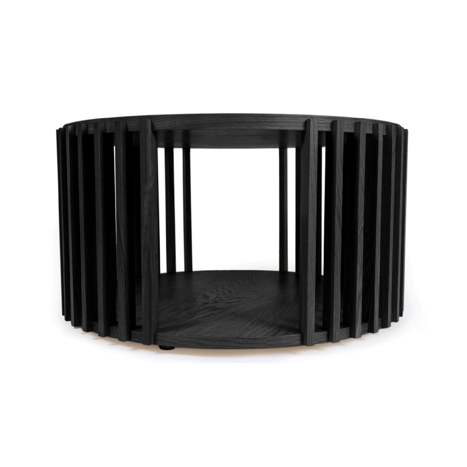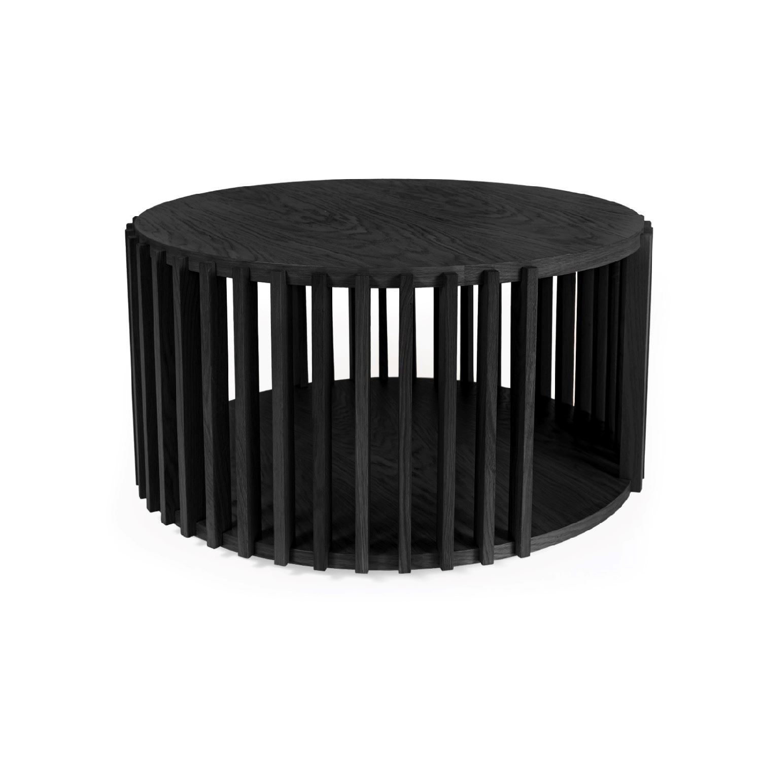 Dimensiuni: Diametru blat: 83 cmInaltime: 42 cmGreutate produs: 20 kgNumar colete: 1Compartimentare: masuta de cafea rotundaMaterial: placa superioara si inferioara realizate din MDF34 cu furnir de stejar vopsit negru si cu finisaj de lac; sipci montate circular realizate din lemn de stejar vopsit negru cu finisaj lacuitCuloare: negruFinisaj: lac