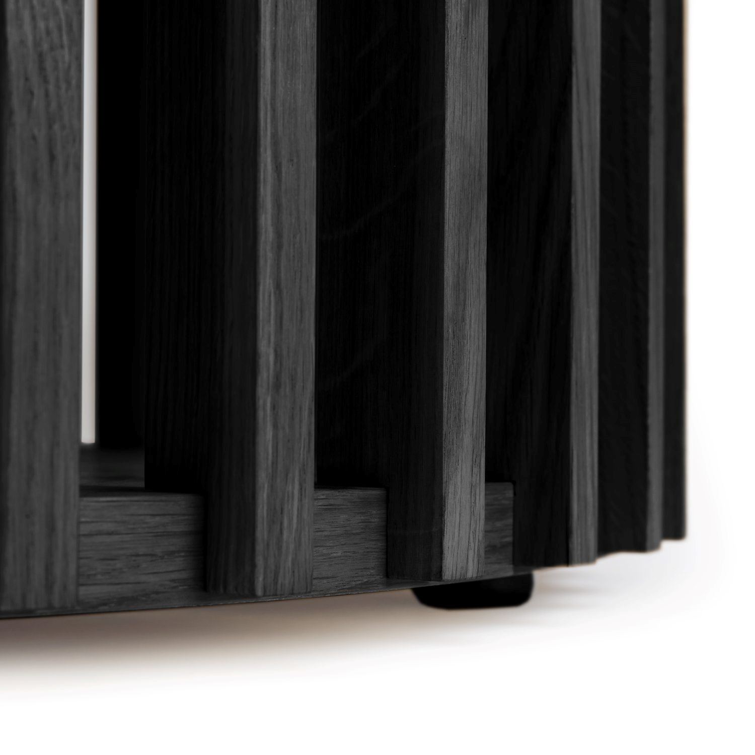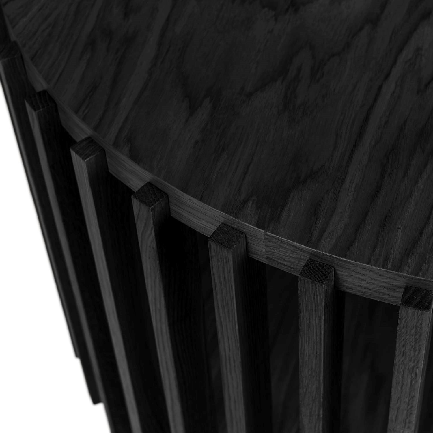 Masuta de cafea din stejar, cu finisaj negru, Round poate fi piesa de accent din livingul dumneavoastra datorita designului special care o recomanda pentru un decor modern. Masuta de cafea din stejar, cu finisaj negru, Round detine placa superioara si placa inferioara realizate din MDF cu furnir de stejar vopsit negru si lacuit si sipci laterale din lemn masiv de stejar vopsit negru. Sipcile sunt amplasate cu spatii intre ele, iar doua portiuni au deschidere mai mare pentru a permite accesul sub blat. Masuta de cafea din stejar, cu finisaj negru, Round se intretine usor prin stergere cu o laveta moale.