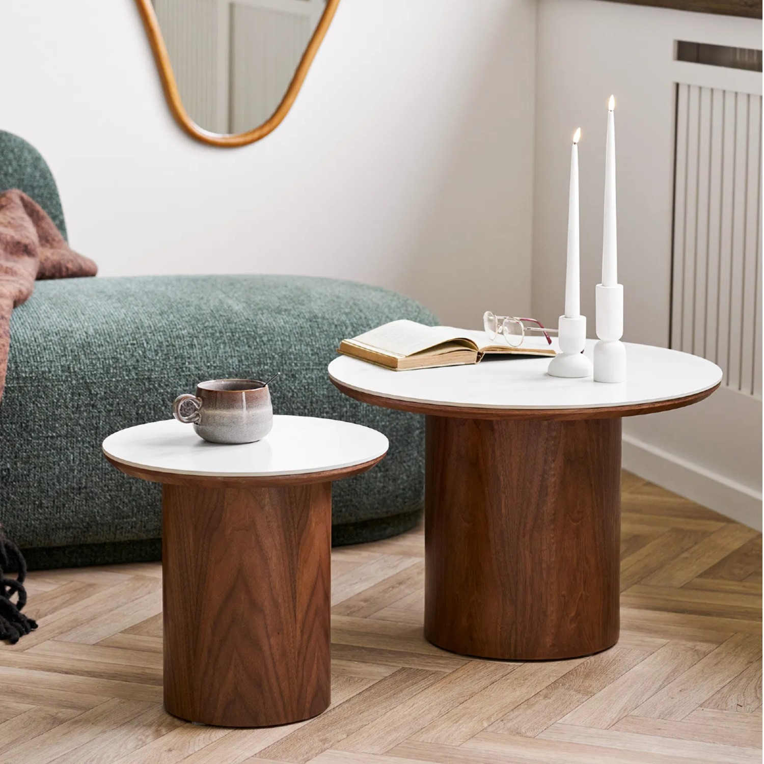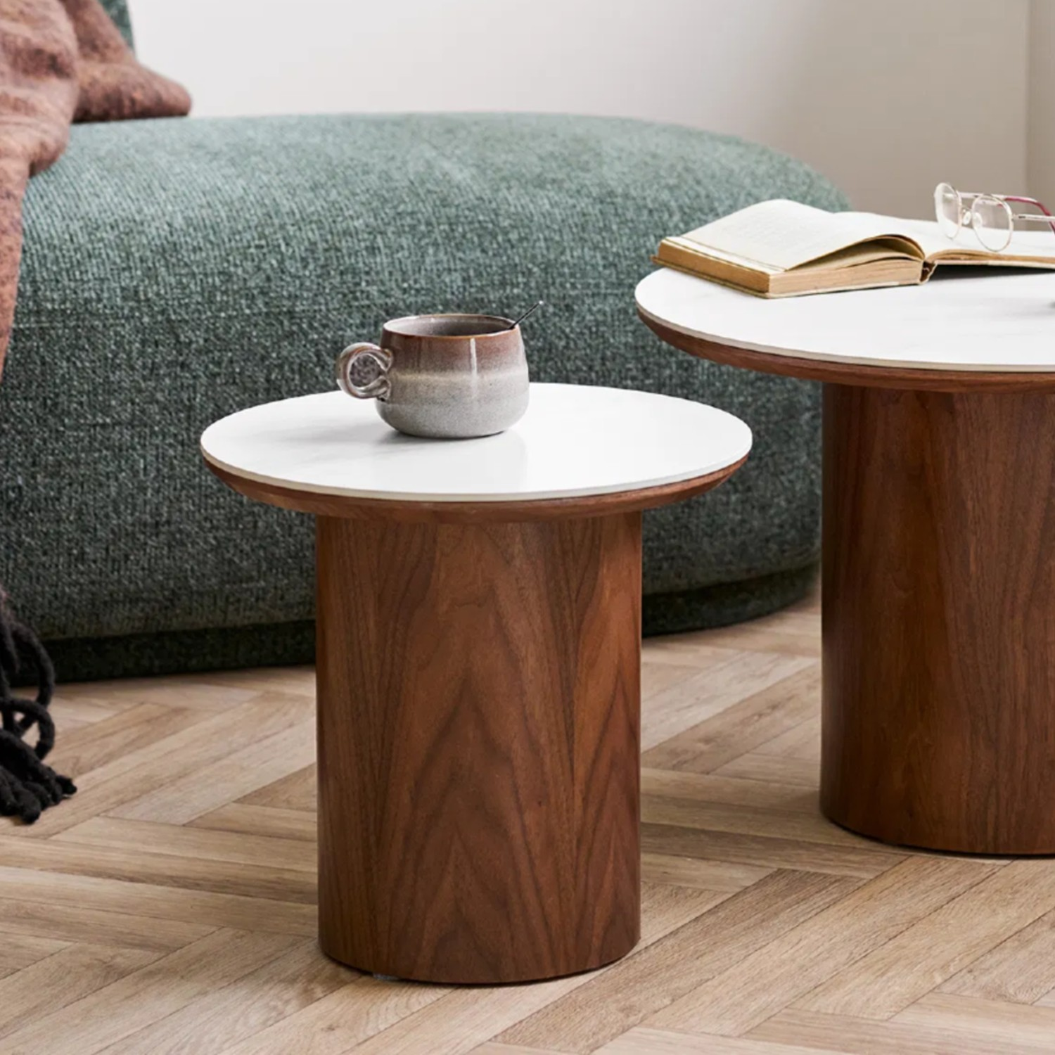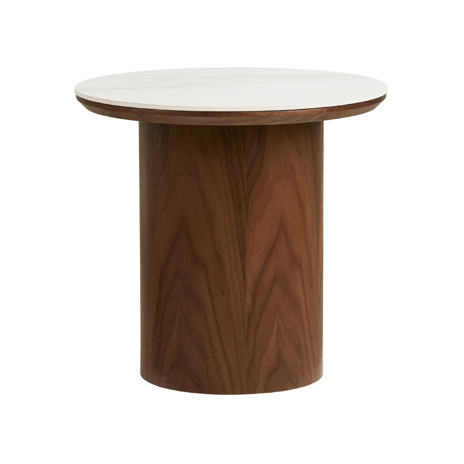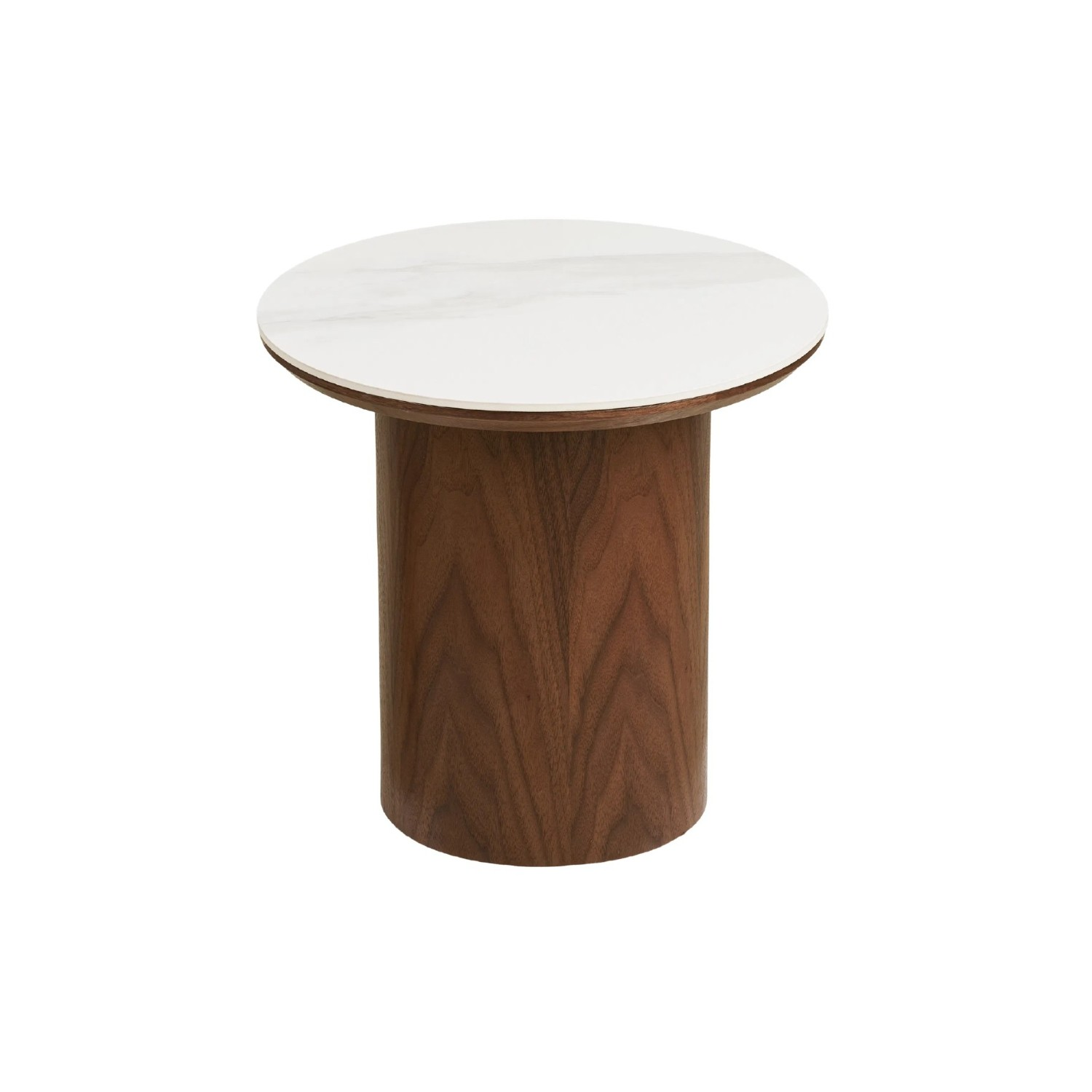 Blatul rotund, realizat din ceramică rezistentă la căldură, zgârieturi și pete, este ușor de întreținut și își păstrează aspectul impecabil în timp. Piciorul cilindric robust, din MDF cu furnir de frasin vopsit culoarea nucului, oferă stabilitate și un accent natural, echilibrând perfect rafinamentul ceramicii cu căldura lemnului.