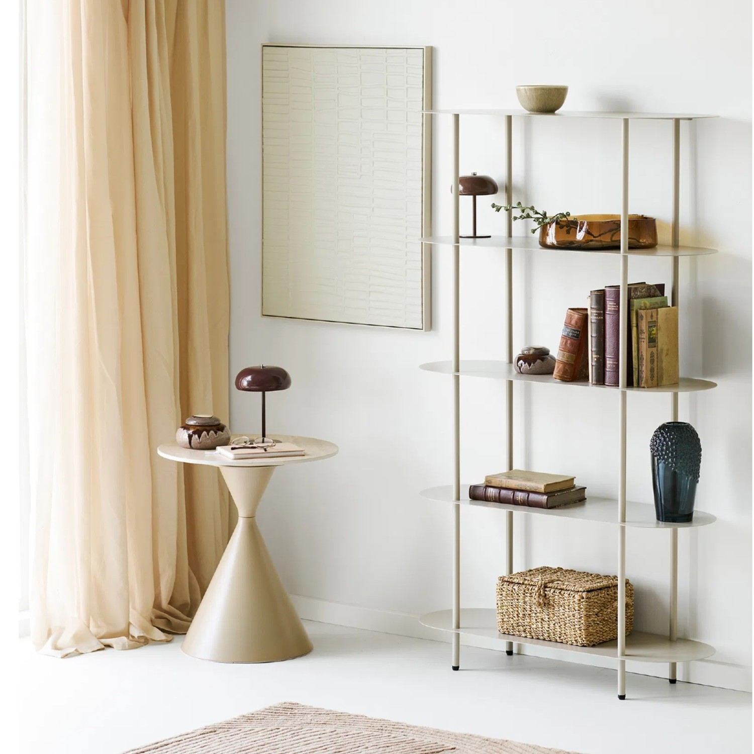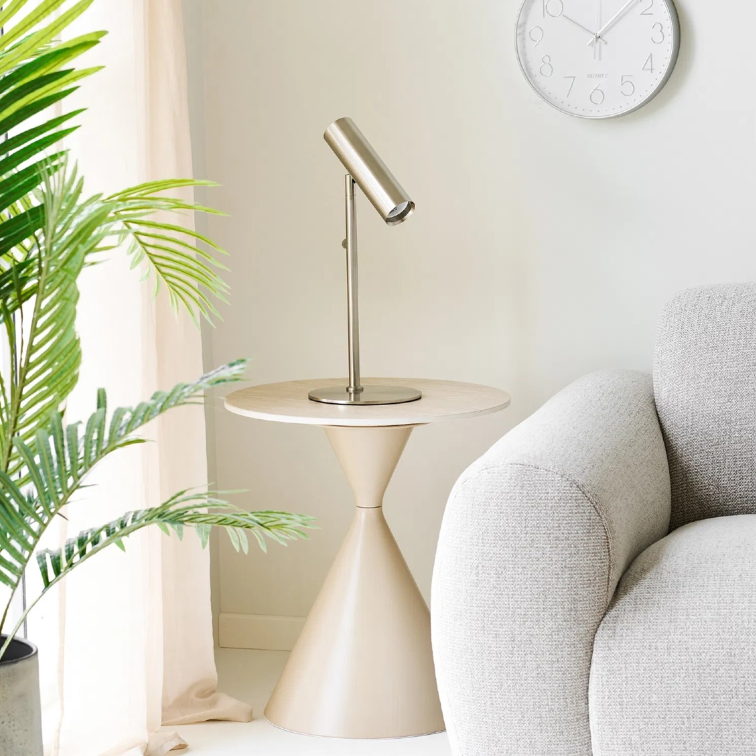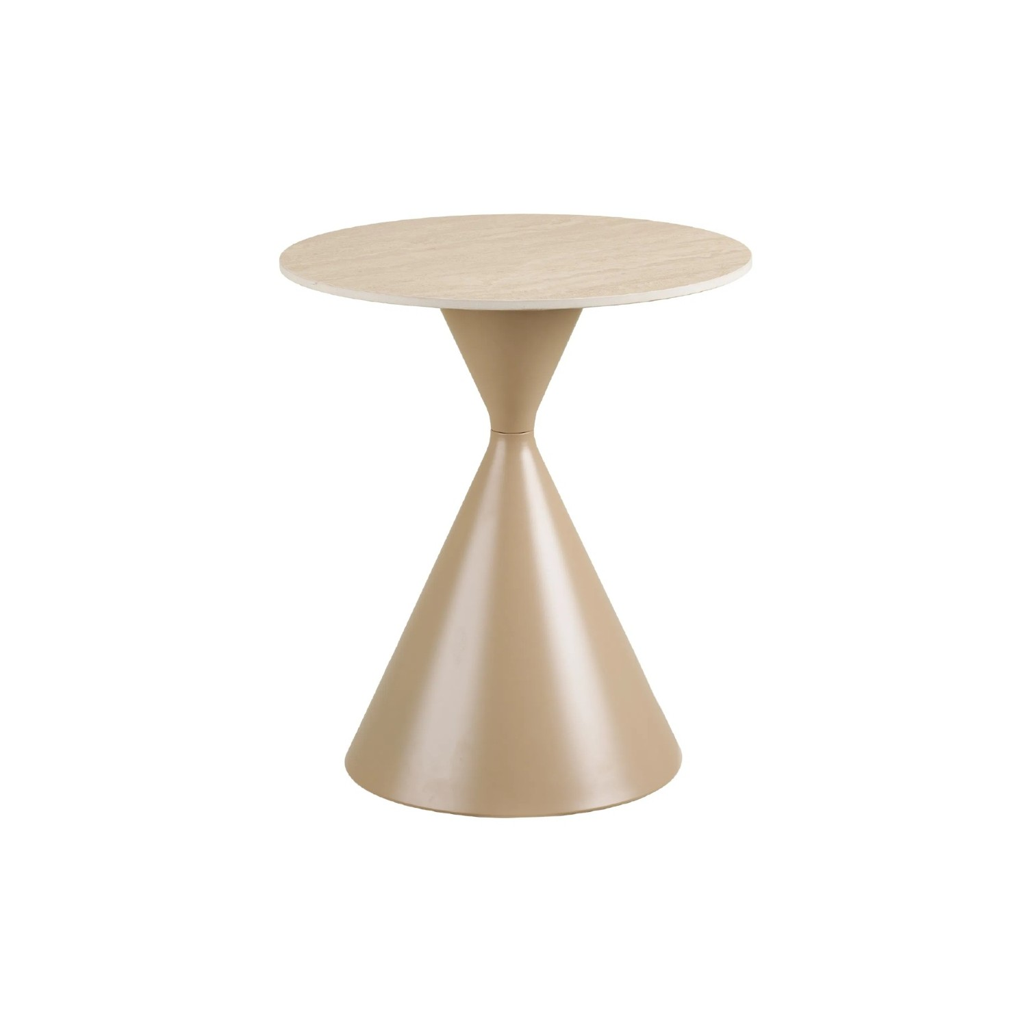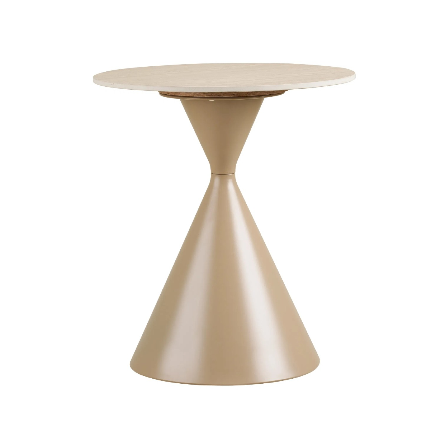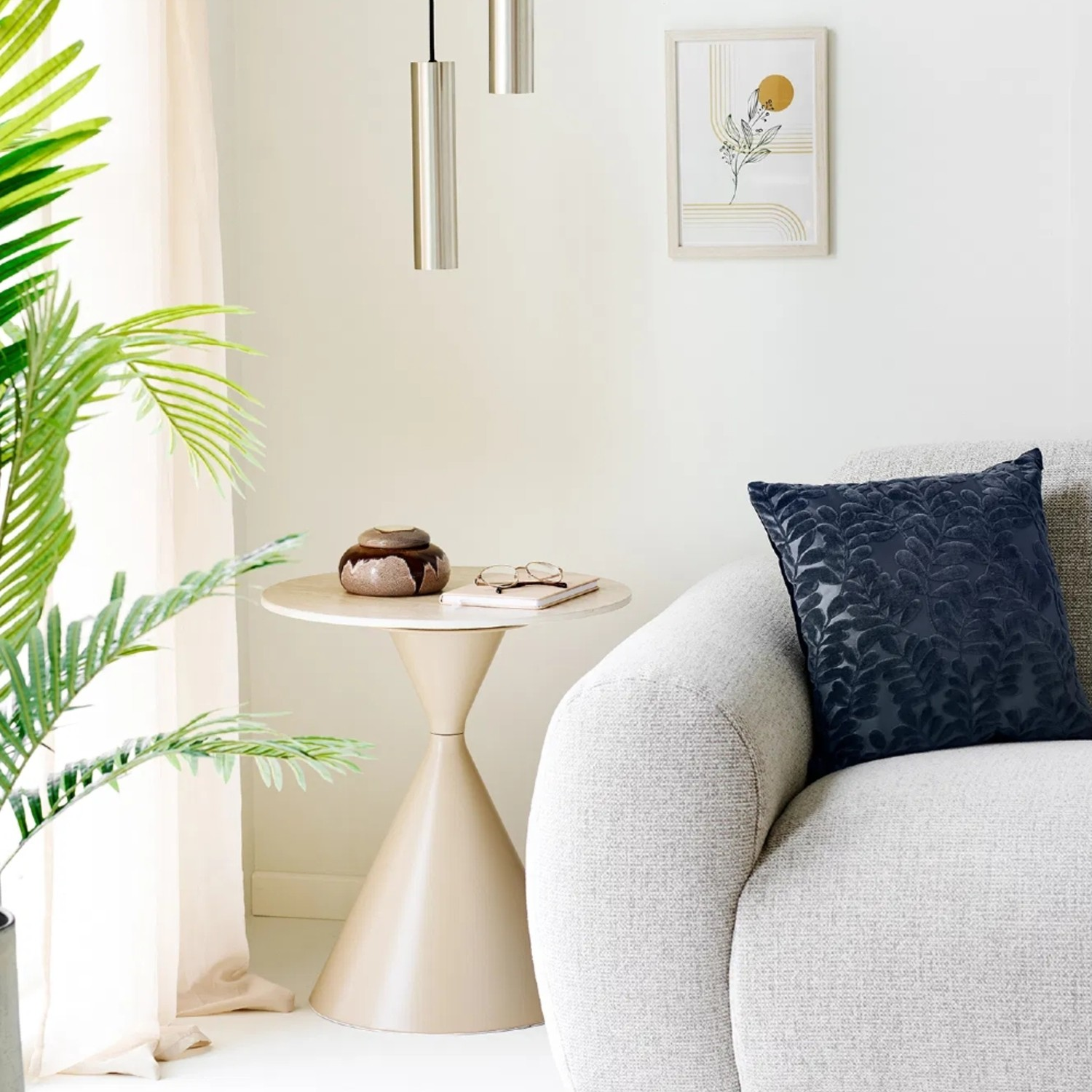 Adaugă un plus de rafinament și stil contemporan livingului tău cu masa laterală sand Annecy, o piesă de mobilier elegantă, concepută pentru interioare moderne. Designul minimalist este pus în valoare de piciorul metalic tip clepsidră, format din două conuri inversate, vopsit într-o nuanță sofisticată sand, ușor de integrat în diverse scheme cromatice.