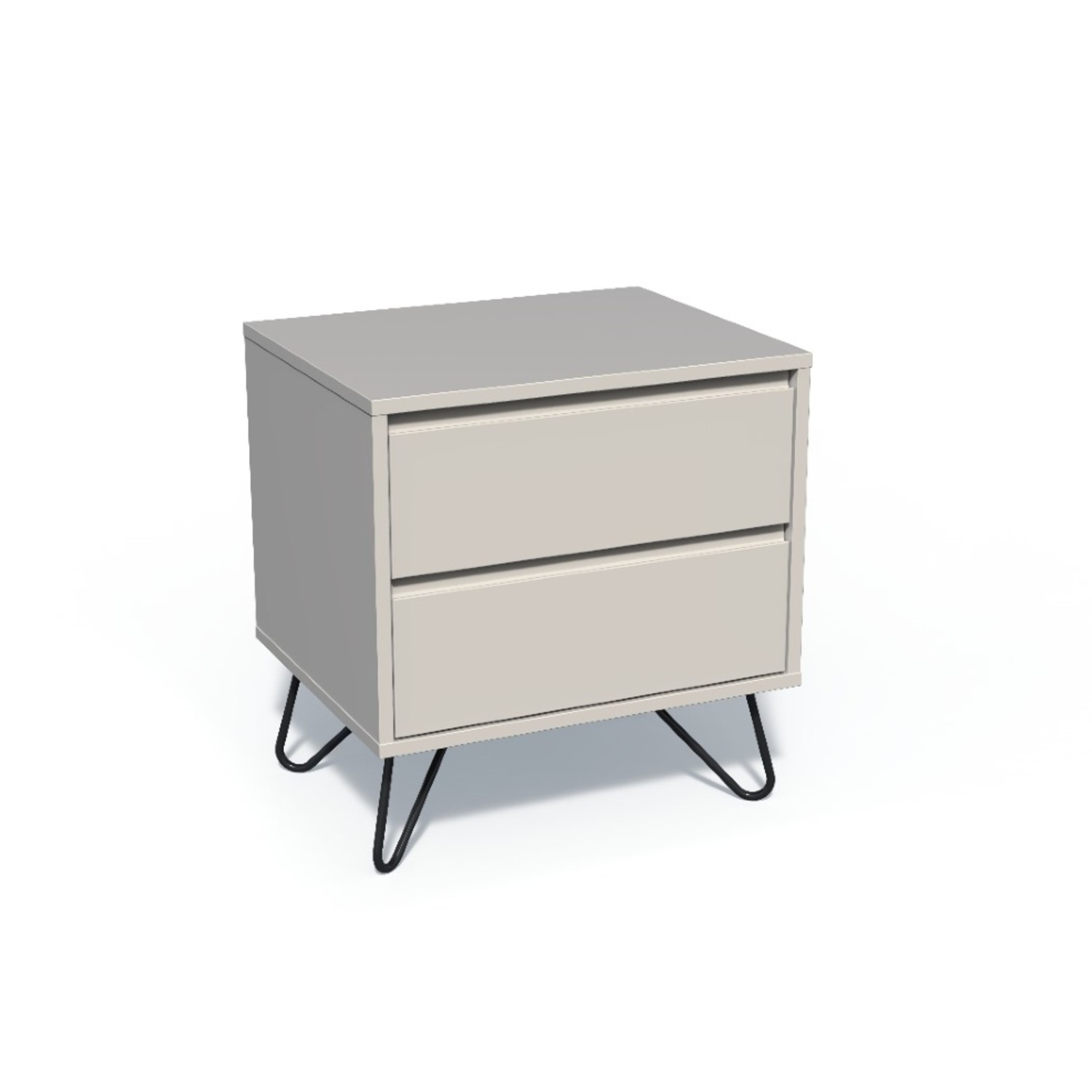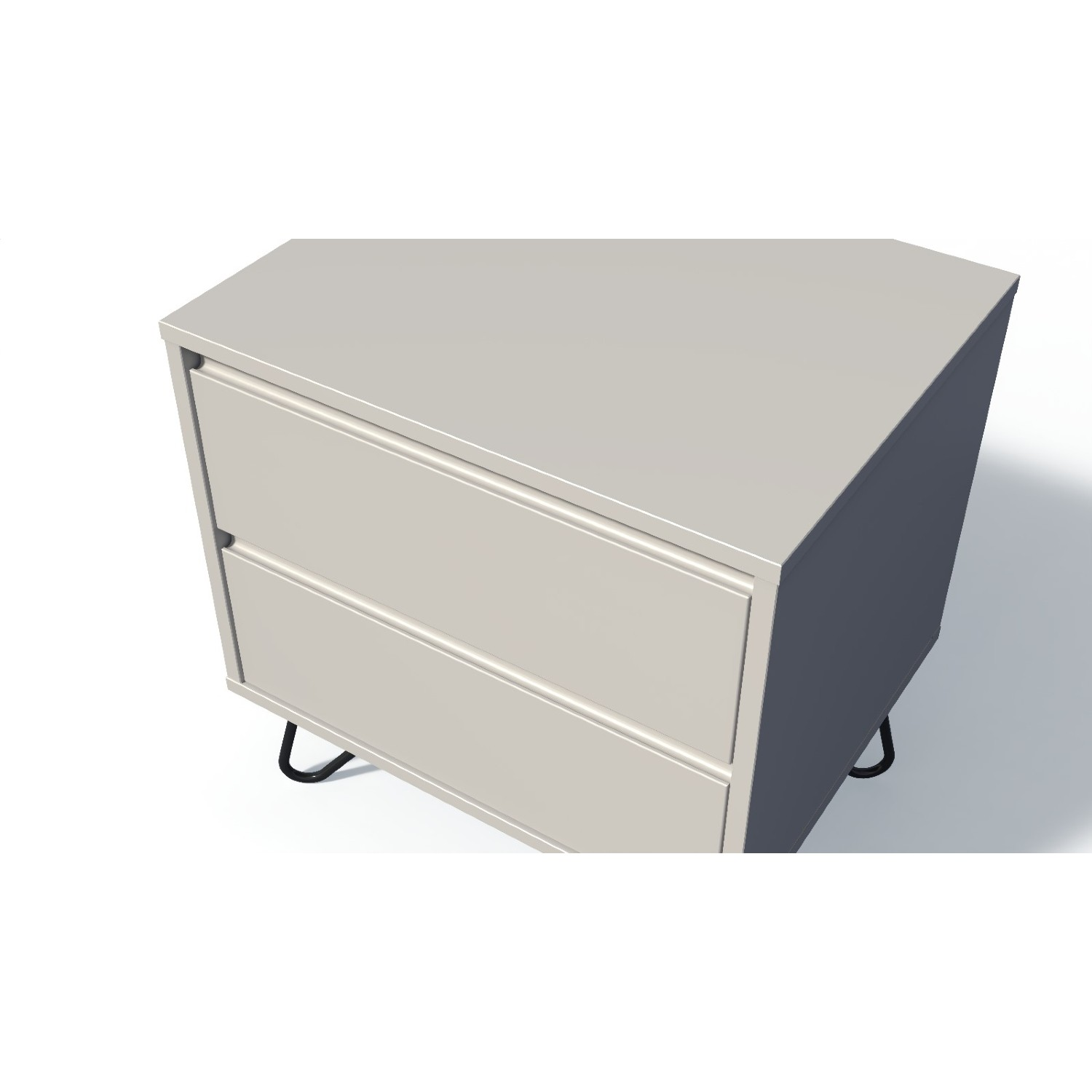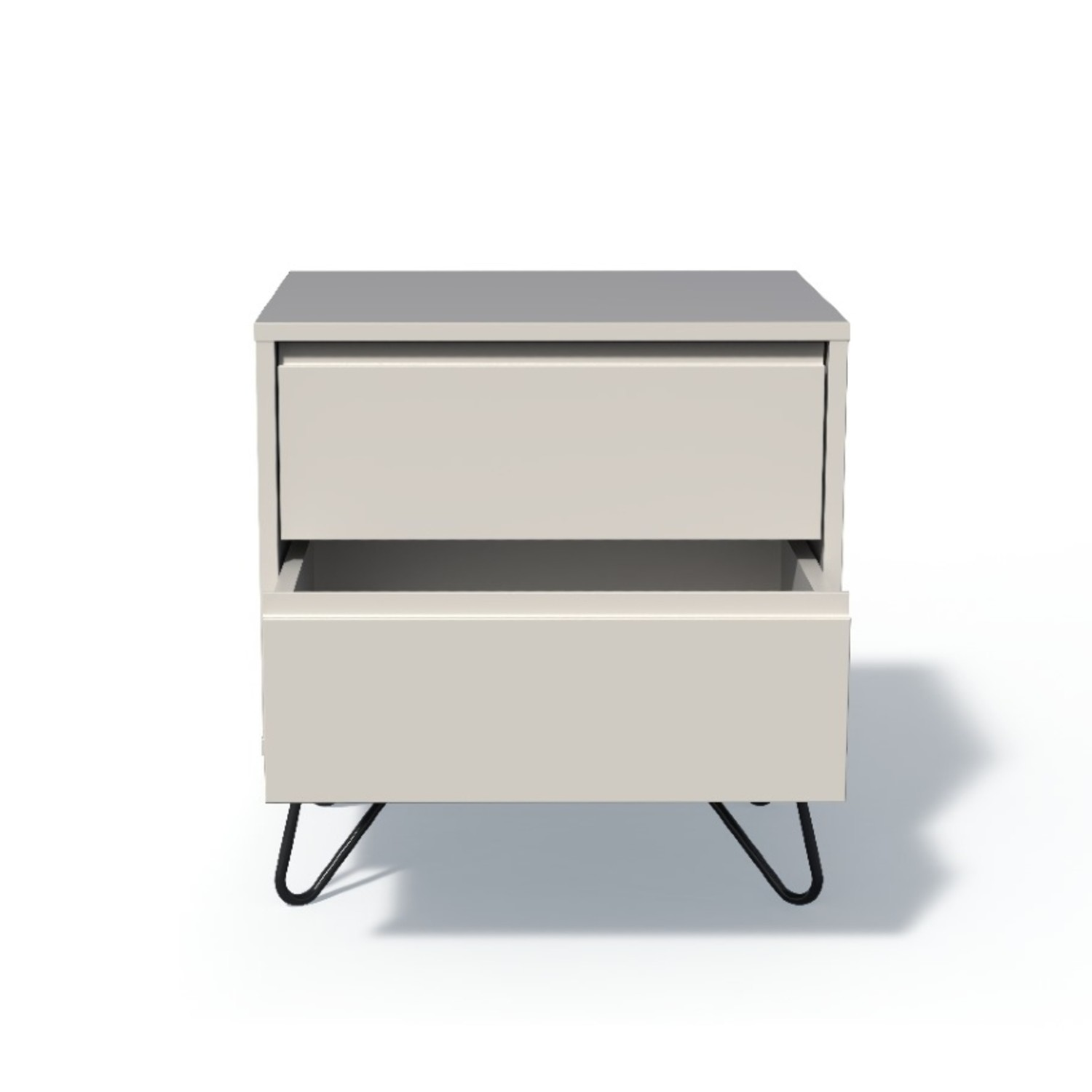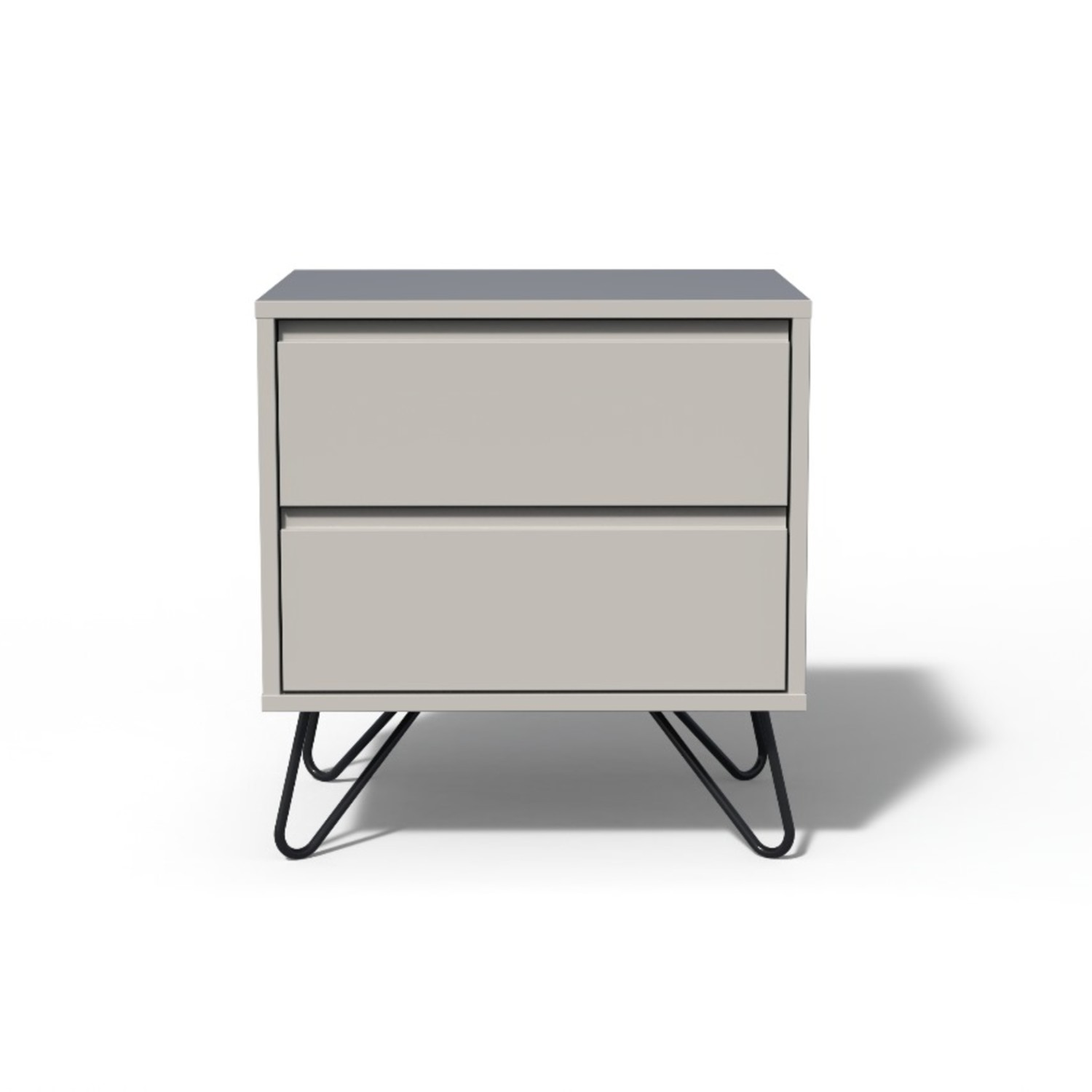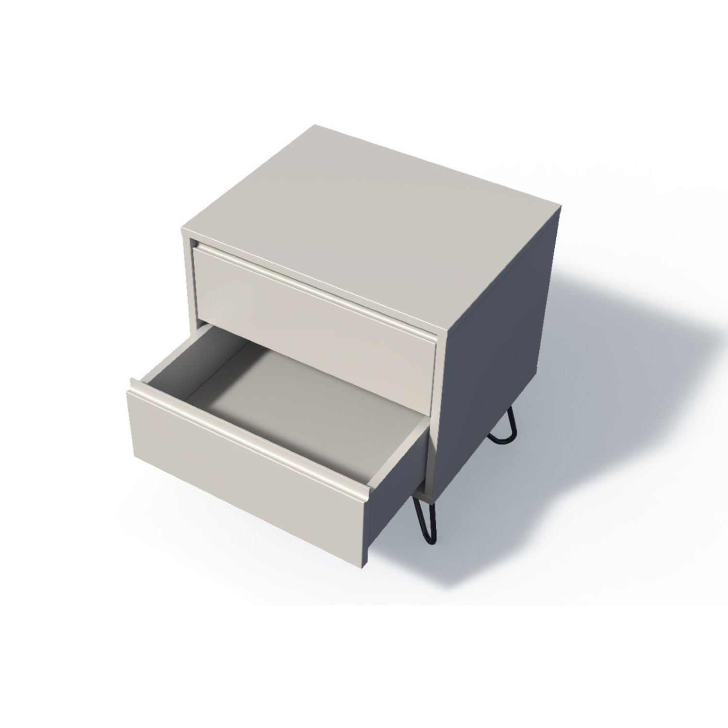 Noptiera cu 2 sertare gri Elona dispune de compartimente spațioase pentru depozitarea unor obiecte de uz zilnic. Designul este completat de picioarele metalice elegante, vopsite negru mat, care adaugă un aer modern și industrial, asigurând totodată o susținere solidă și o distanță optimă față de podea pentru o curățare ușoară dedesubt.
