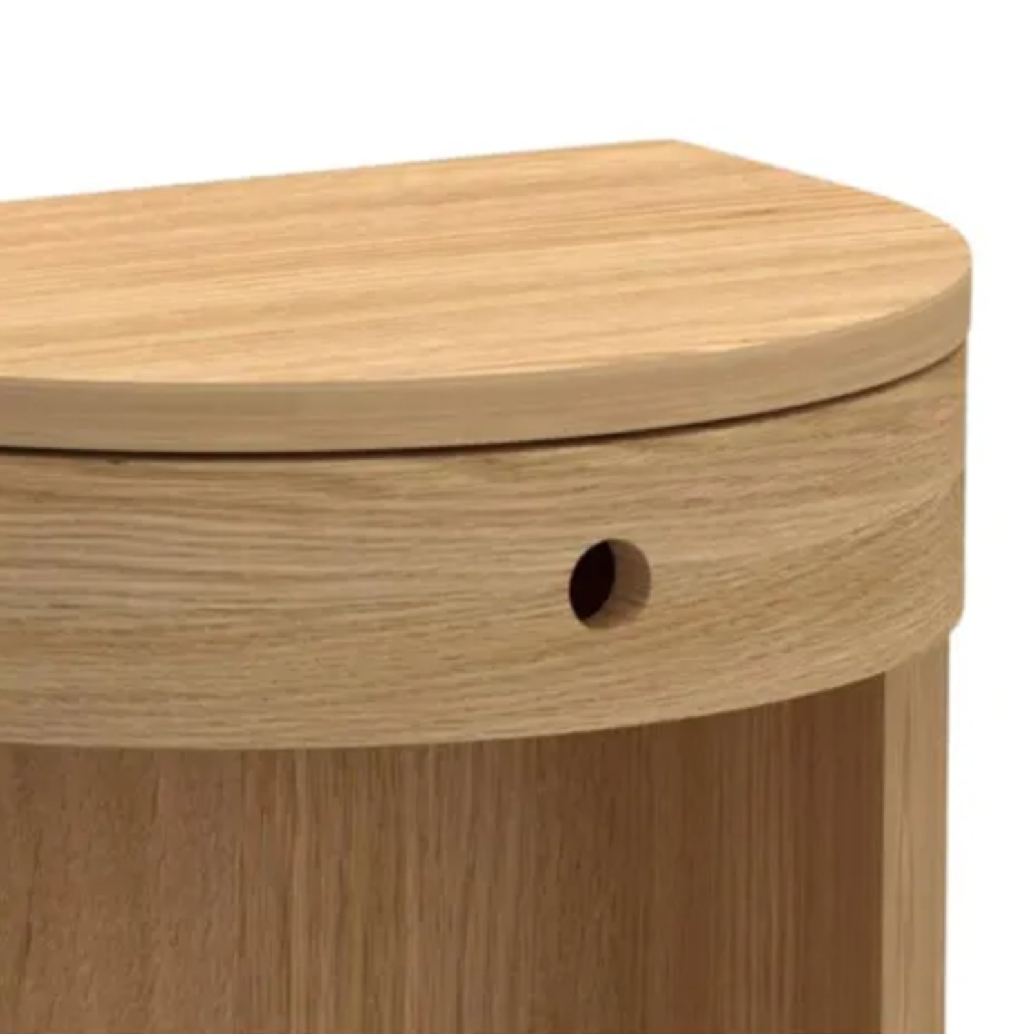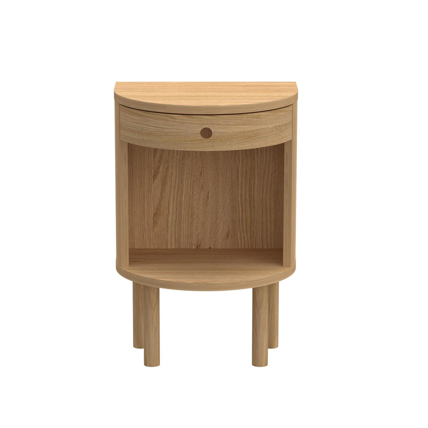 Noptiera semicerc cu 1 sertar si 1 nisa stejar natur Paron este o noptiera moderna, cu un design minimalist. Realizata din furnir de stejar mat lacuit, topul si baza sunt finisate cu lac poliuretanic (PU) pentru o rezistenta sporita, cadrul si sertarul sunt tratate cu lac nitrocelulozic (NC), oferind un aspect natural si elegant , completand un design unitar si durabil. Noptiera semicerc cu 1 sertar si 1 nisa natur Paron detine un sertar si un compartiment deschis potrivit pentru lucrurile mici. Picioarele cilindrice din stejar mat lacuit cu NC, cu inaltimea de 20 cm ii adauga noptierei semicerc cu 1 sertar si 1 nisa stejar natur Paron un detaliu inspirat din designul scandinav, care ii ofera stabilitate si un aspect echilibrat designului semicircular.