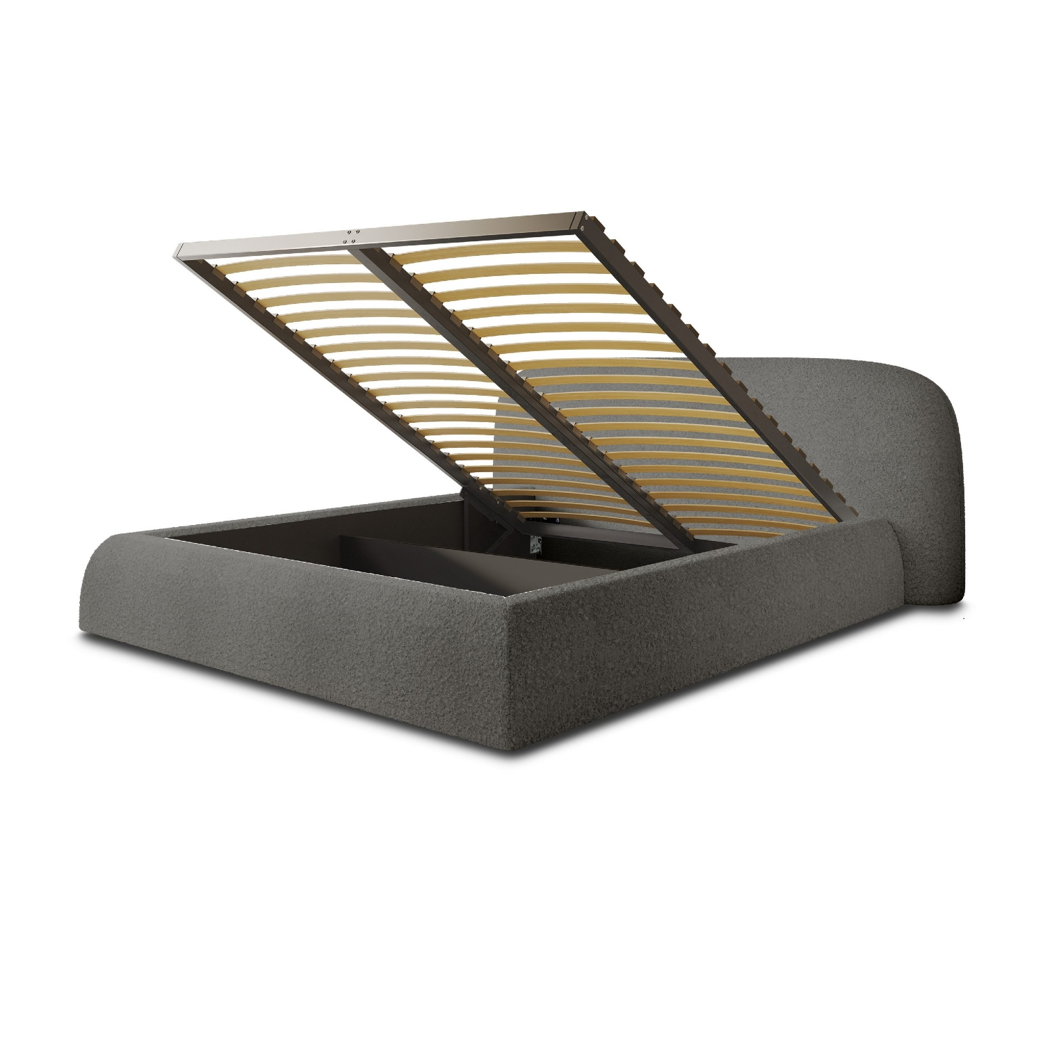 Patul tapițat cu somieră rabatabilă 160x200 cm gri închis Atlanta combină designul modern, confortul ridicat și funcționalitate. Cu tăblia sa elegantă, tapițeria moale, și liniile curate, patul tapițat cu somieră rabatabilă 160x200 cm gri închis Atlanta se potrivește perfect în orice dormitor. Baza generoasă a patului de sub întreaga suprafață întinsă oferă spațiu practic de depozitare, împărțit în două secțiuni funcționale, sprijinite pe o bază durabilă din HDF astfel, dormitorul rămâne ordonat și organizat. Somiera metalică solidă rabatabilă oferă un confort optim pentru somn, ea se ridica ușor cu ajutorul unui mecanism cu arc, permițând ridicarea din partea frontală a patului și acces rapid la spațiul de dedesubt. Textilul din colecția de calitate Quelle (Quelle 92) este un material moale bouclé care oferă patului o notă luxoasă și confortabilă. Picioarele metalice rezistente permit o aerisire optimă a spațiului de sub pat. Transformă-ți dormitorul într-un spațiu de relaxare sofisticat cu patul tapițat cu somieră rabatabilă 160x200 cm gri închis Atlanta cu un design modern și linii rotunjite. Designul său versatil permite combinarea cu o gamă largă de textile și accesorii pentru un ambient armonios.
