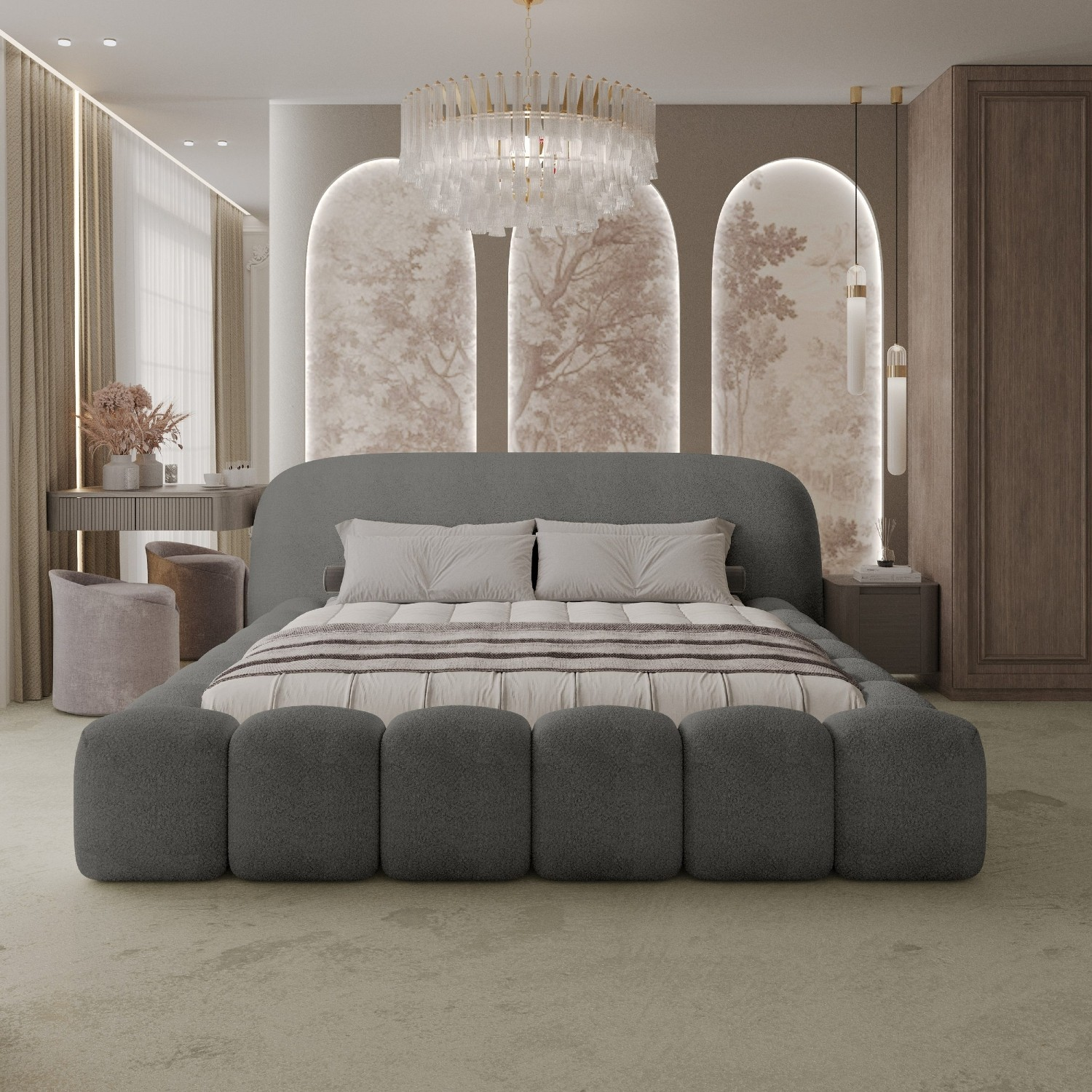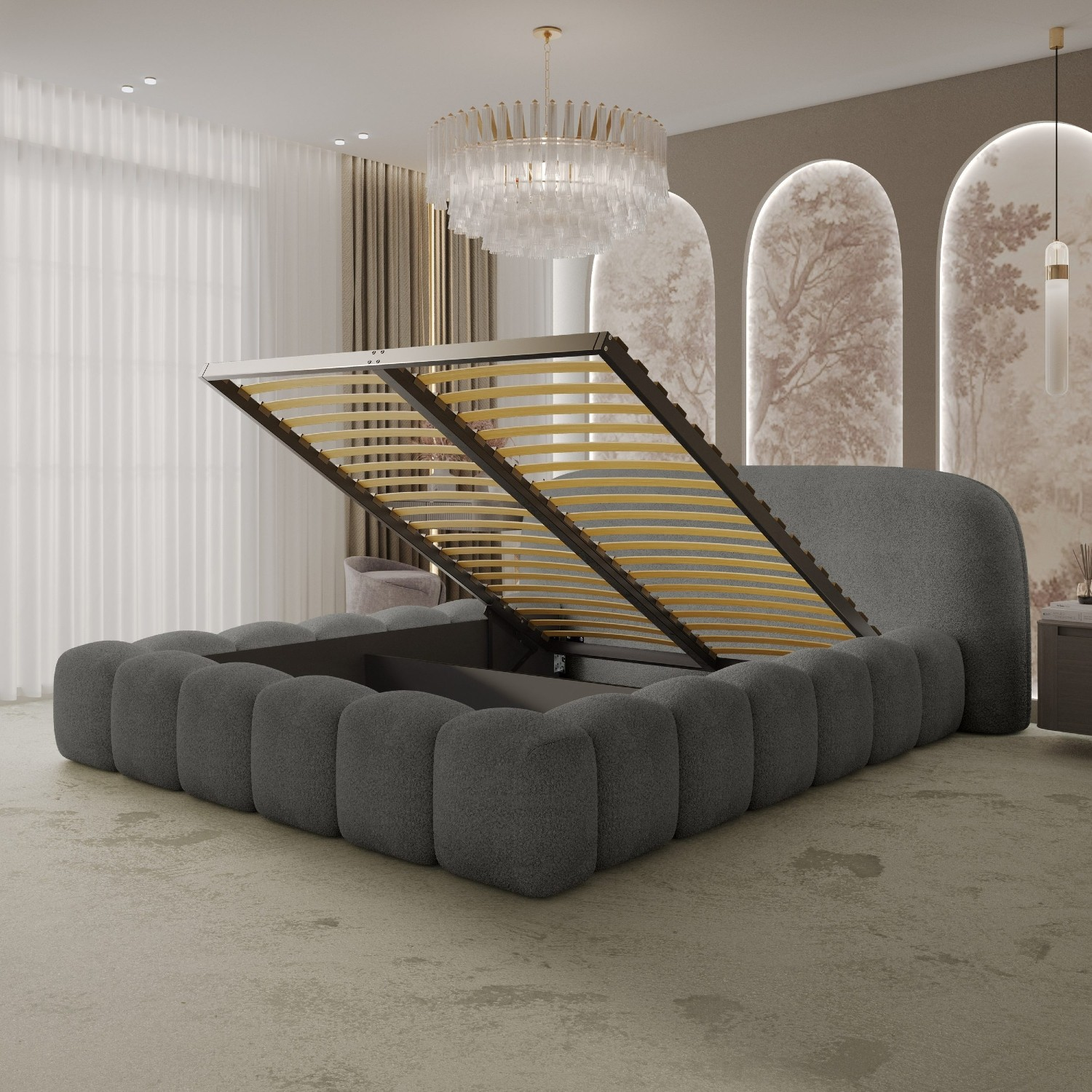 Patul tapițat cu somieră rabatabilă 160 x 200 cm gri închis Orlando este un pat modern cu tăblie supradimensionată pentru un ambient de dormitor stilat și confortabil. Spațiul de depozitare integrat oferă un compartiment generos, împărțit în două secțiuni funcționale, sprijinite pe o bază durabilă din HDF astfel, dormitorul rămâne ordonat și organizat – fără mobilă suplimentară. Materialul moale și texturat bouclé gri închis (Quelle 92) este un textil elegant, modern și ușor de întreținut. Patul tapițat cu somieră rabatabilă 160 x 200 cm gri închis Orlando include somieră metalică de înaltă calitate pentru suport stabil și confort plăcut la dormit, potrivit pentru persoane singure, cupluri și familii. O saltea bine aleasă, impreună cu somiera asigură o distribuție uniformă a greutății și contribuie semnificativ la un somn ergonomic și odihnitor. Somiera este rabatabilă cu ajutorul unui mecanism cu arc, permițând ridicarea ușoară din partea frontală a patului și acces rapid la spațiul de dedesubt.