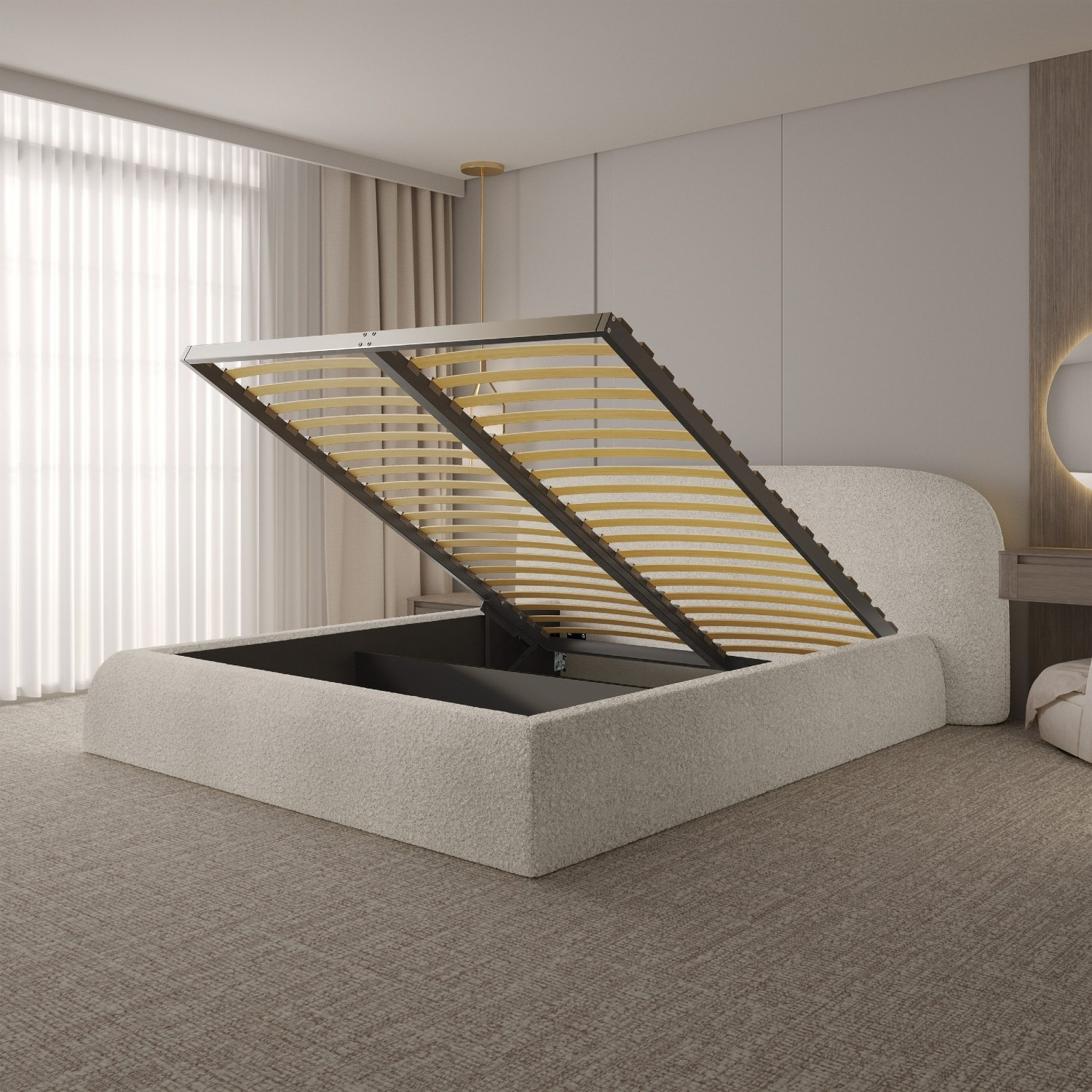 Patul tapițat cu somieră metalică rabatabilă 200 x 200 cm bej Atlanta combină designul modern, confortul ridicat și funcționalitate. Cu tăblia sa elegantă, tapițeria moale, și liniile curate, patul tapițat somieră metalică rabatabilă 200 x 200 cm bej Atlanta se potrivește perfect în orice dormitor. Baza generoasă a patului de sub întreaga suprafață întinsă oferă spațiu practic de depozitare, împărțit în două secțiuni funcționale, sprijinite pe o bază durabilă din HDF astfel, dormitorul rămâne ordonat și organizat. Somiera solidă metalică rabatabilă oferă un confort optim pentru somn, ea se ridica ușor cu ajutorul unui mecanism cu arc, permițând ridicarea din partea frontală a patului și acces rapid la spațiul de dedesubt. Textilul din colecția de calitate Quelle (Quelle 03) este un material moale bouclé care oferă patului o notă luxoasă și confortabilă. Picioarele metalice rezistente permit o aerisire optimă a spațiului de sub pat. Transformă-ți dormitorul într-un spațiu de relaxare sofisticat cu patul tapițat somieră metalică rabatabilă 200 x 200 cm bej Atlanta cu un design modern și linii rotunjite. Designul său versatil permite combinarea cu o gamă largă de textile și accesorii pentru un ambient armonios.