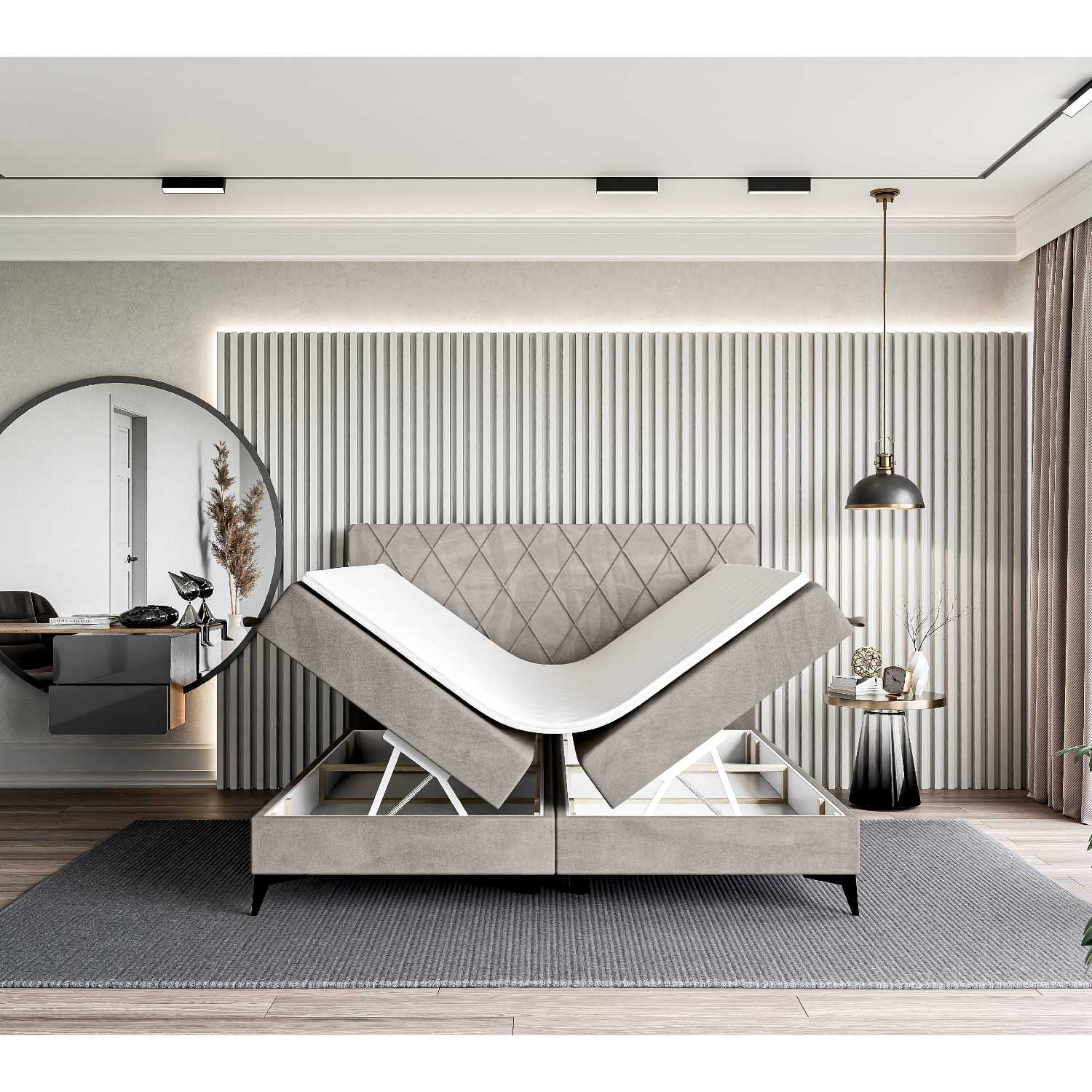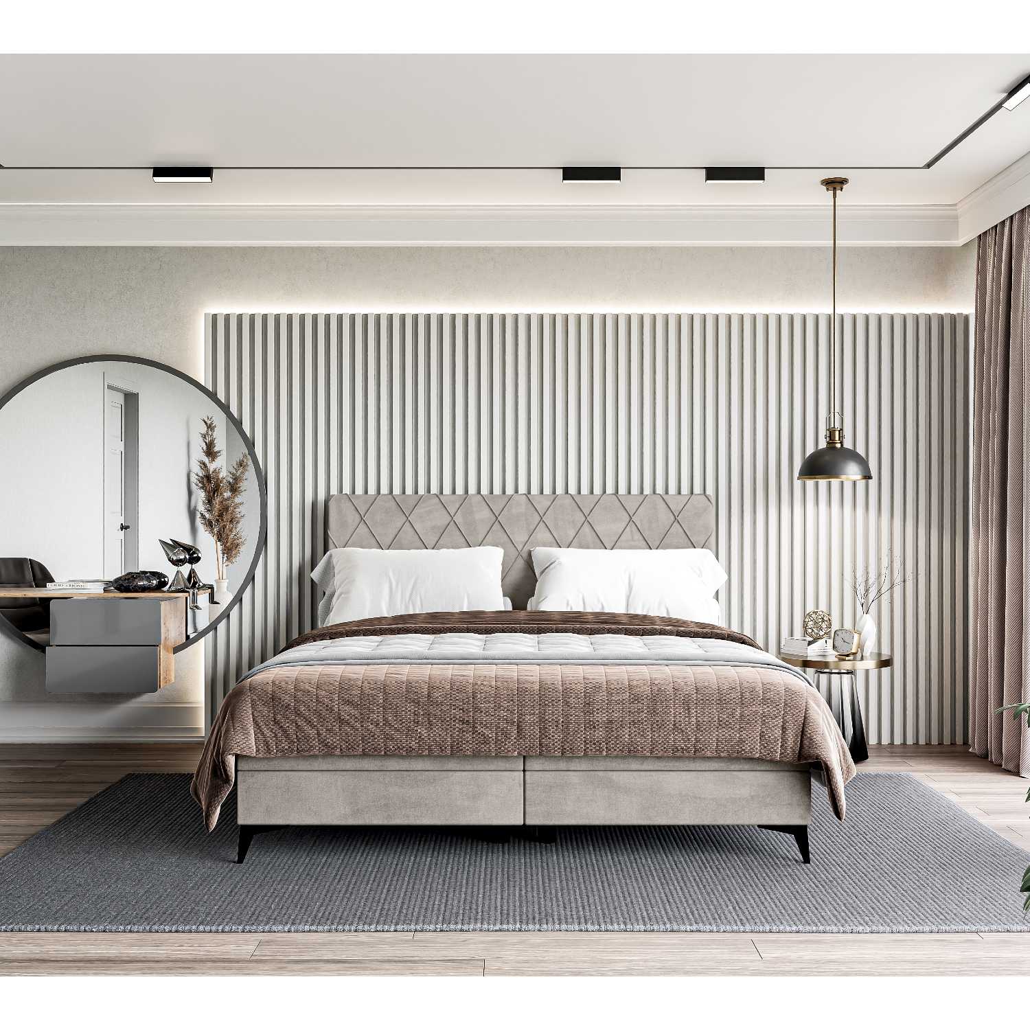 Cauți un pat boxspring 140 x 200 cm modern, confortabil și cu un design atractiv? Modelul Milo bej este alegerea ideală pentru un dormitor elegant și funcțional. Cu o tăblie înaltă tapițată, decorată cu cusături în formă de romb, acest pat boxspring devine rapid piesa centrală a camerei tale.