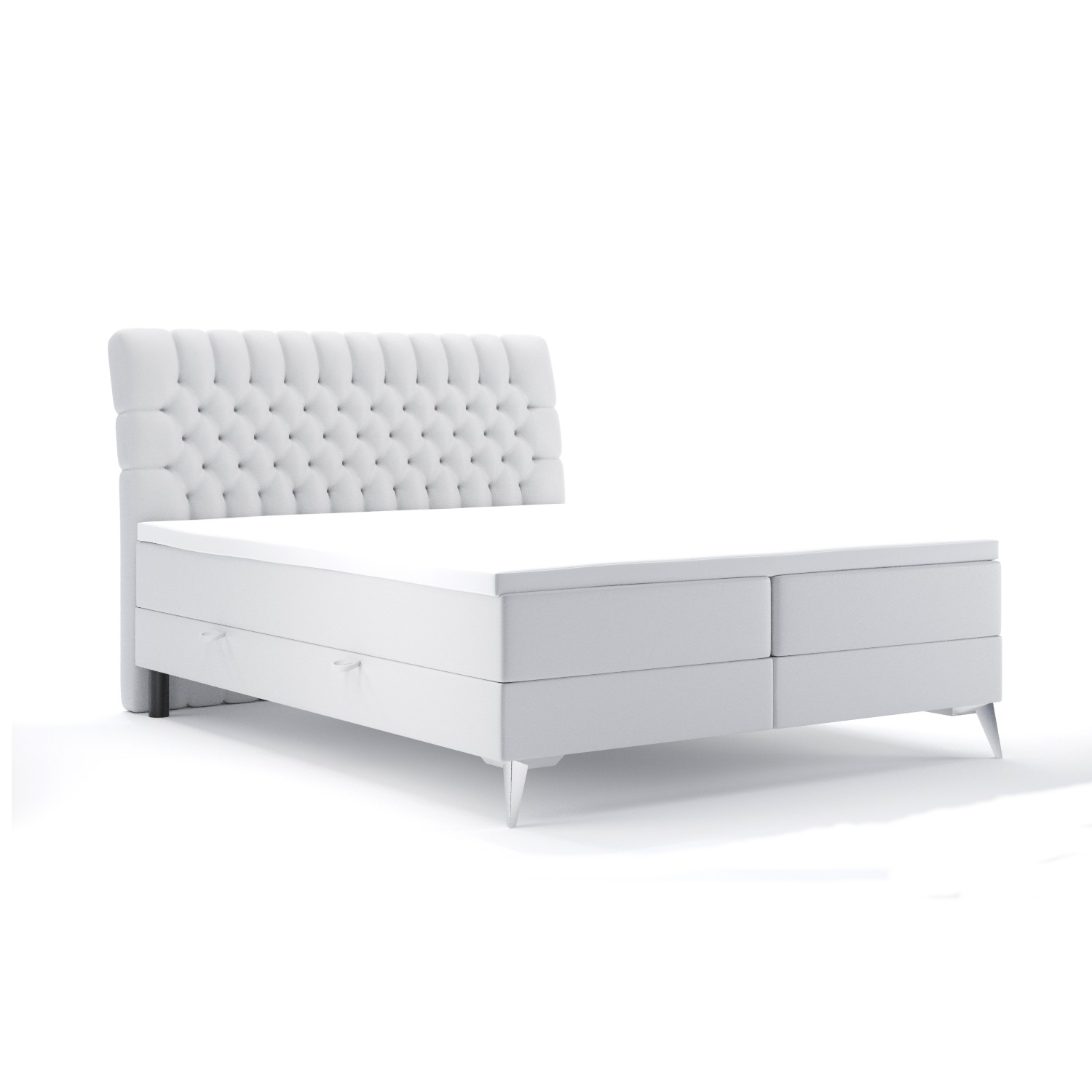 Material: structură din lemn, interior lăzi depozitare din PAL melaminat alb de 16 mm, tapițerie din piele ecologică PU (Madryt 920), saltea cu grosime de 20 cm cu bază cu arcuri Bonnell și umplutură cu spumă poliuretanică T-25, saltea adițională 5 cm cu umplutură cu spumă T-21; picioare din metal cu finisaj argintiu