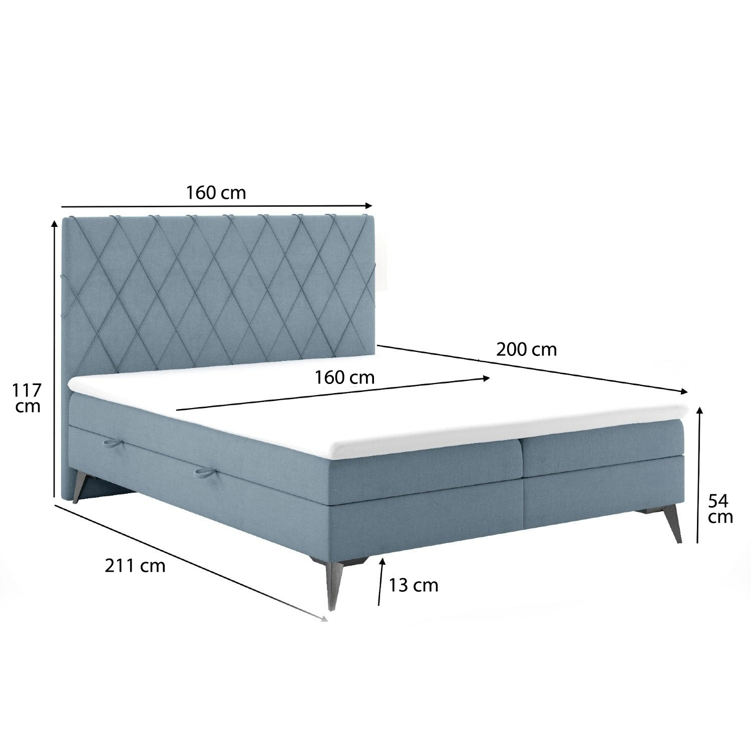 Patul tapițat boxspring 160 x 200 albastru deschis Milo este disponibil în mai multe culori și dimensiuni, adaptându-se perfect oricărui tip de dormitor.