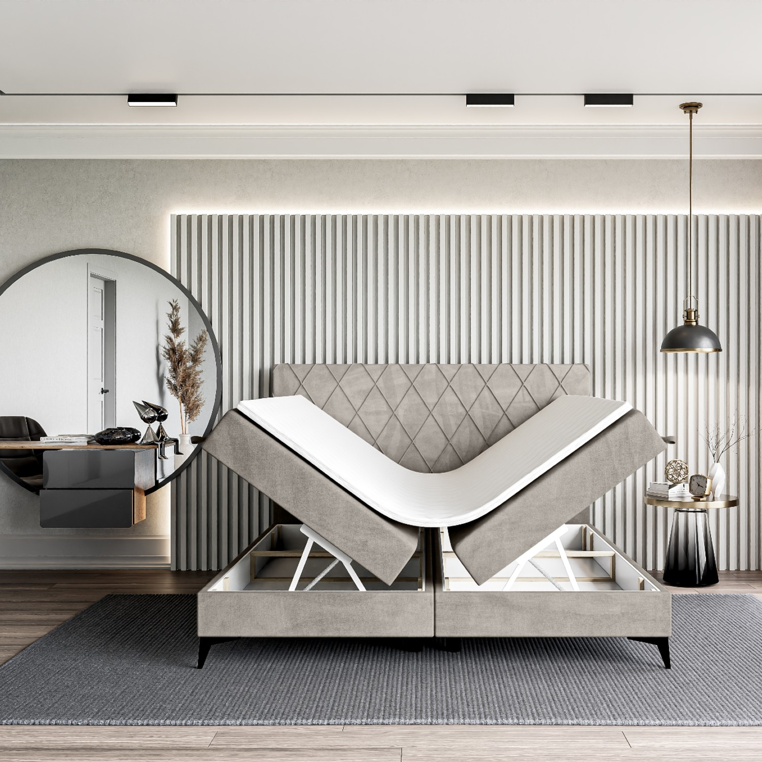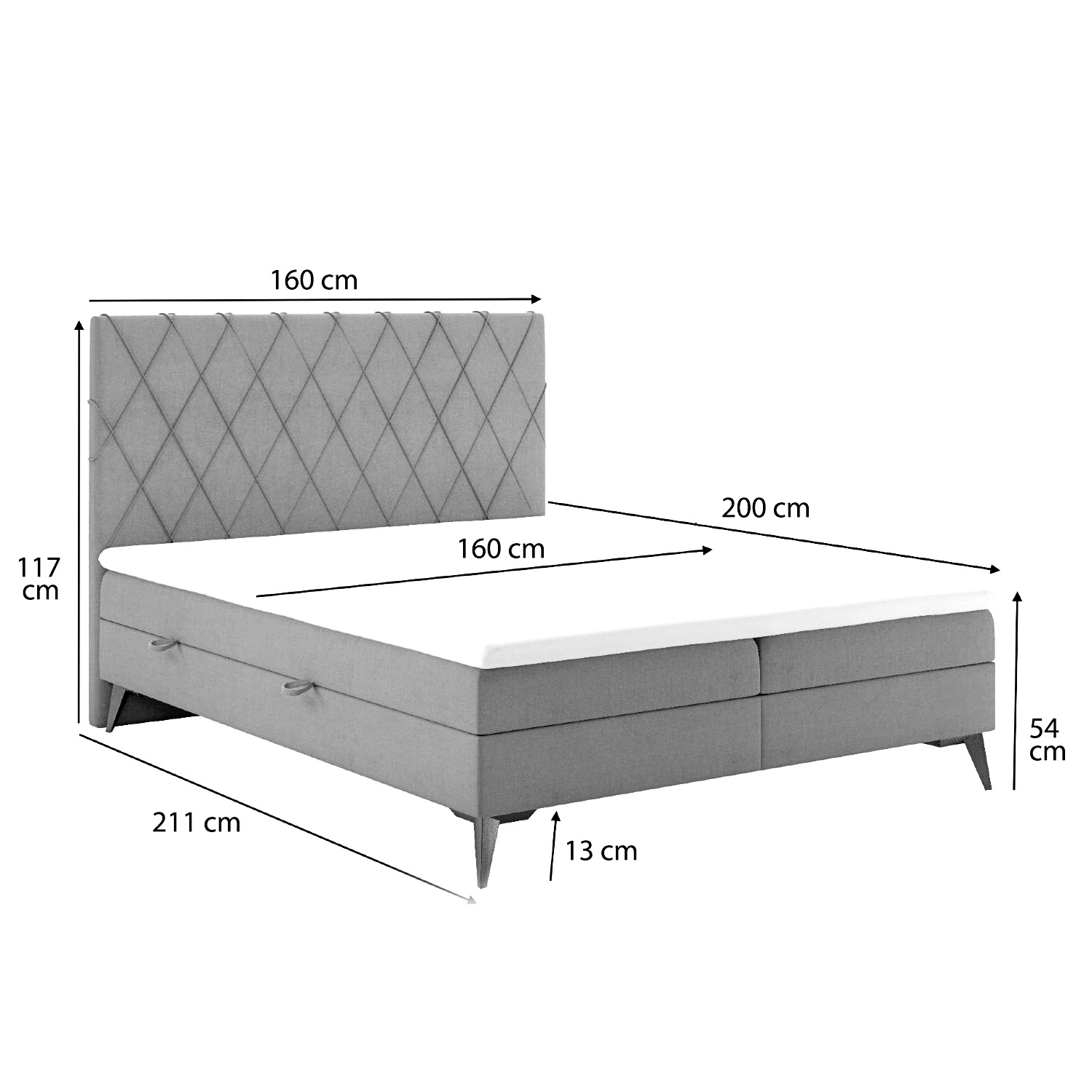 Componente: pat tapițat boxspring 160 x 200 cm, tăblie mare 117 cm, topper; 2 lăzi de depozitare