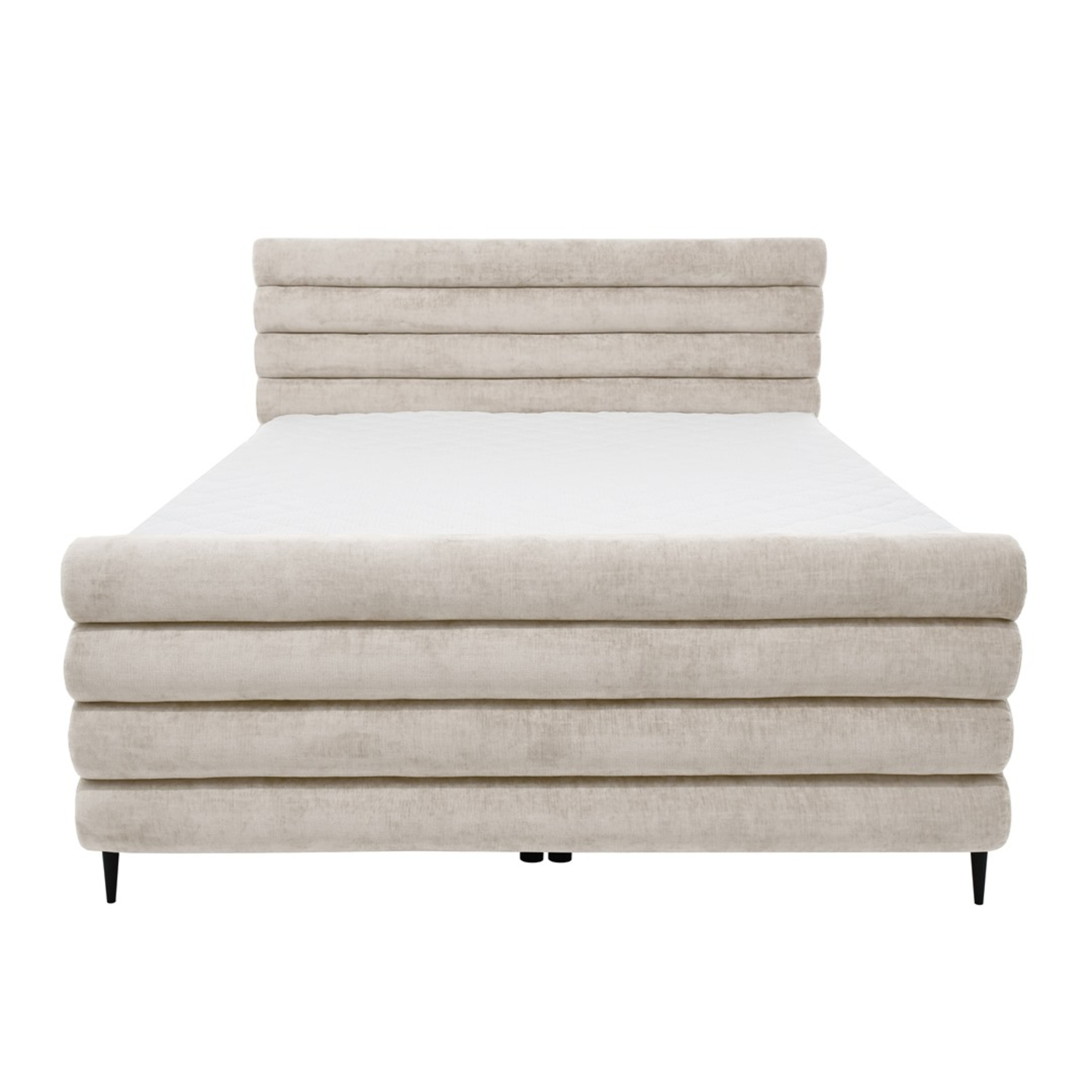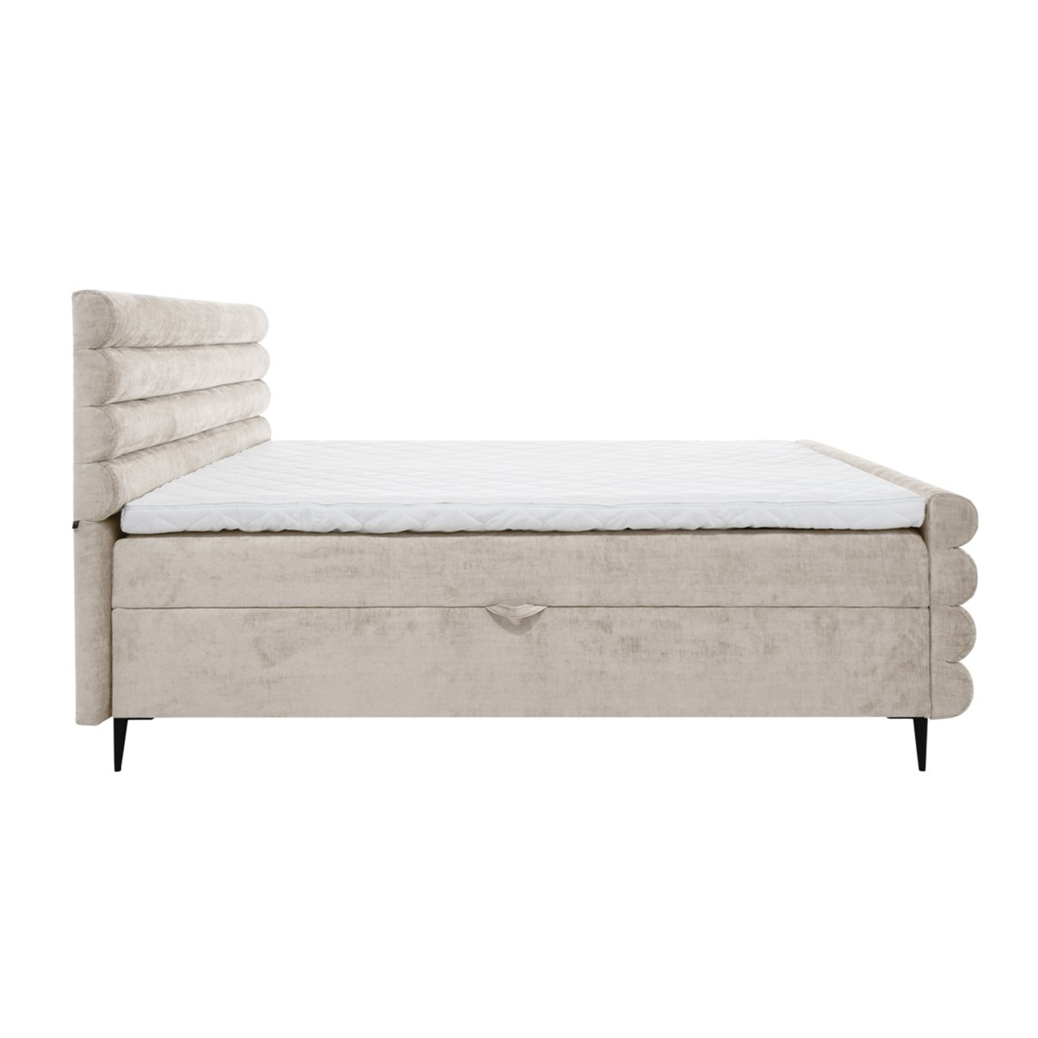 Patul tapițat boxspring 160 x 200 cm bej Noel îmbină confortul avansat cu un design modern și elegant, fiind alegerea ideală pentru un dormitor sofisticat. Farmecul său aparte este dat de dungile decorative orizontale de pe tăblia înaltă și footboard, care conferă un aspect contemporan și rafinat. Tapițeria de calitate (Clara 215.03) asigură rezistența îndelungată și păstrarea aspectului pentru mult timp.