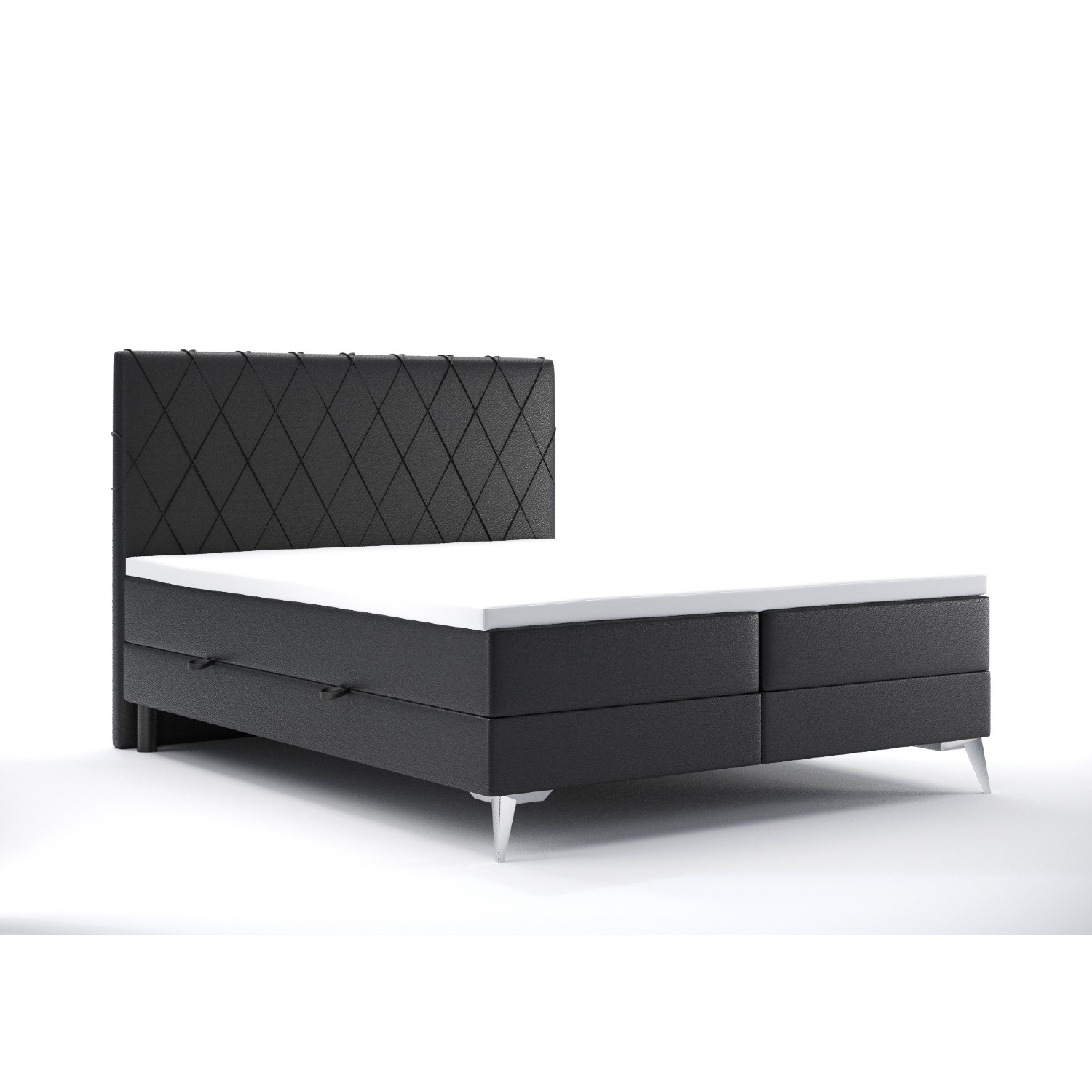 Material: structură din lemn, interior lăzi depozitare din PAL melaminat alb, tapițerie din piele ecologică PU (Madryt 9100), saltea cu grosime de 20 cm cu bază cu arcuri Bonnell și umplutură cu spumă poliuretanică T-25, saltea adițională de 5 cm cu umplutură cu spumă T-21; picioare din metal cu finisaj negru mat