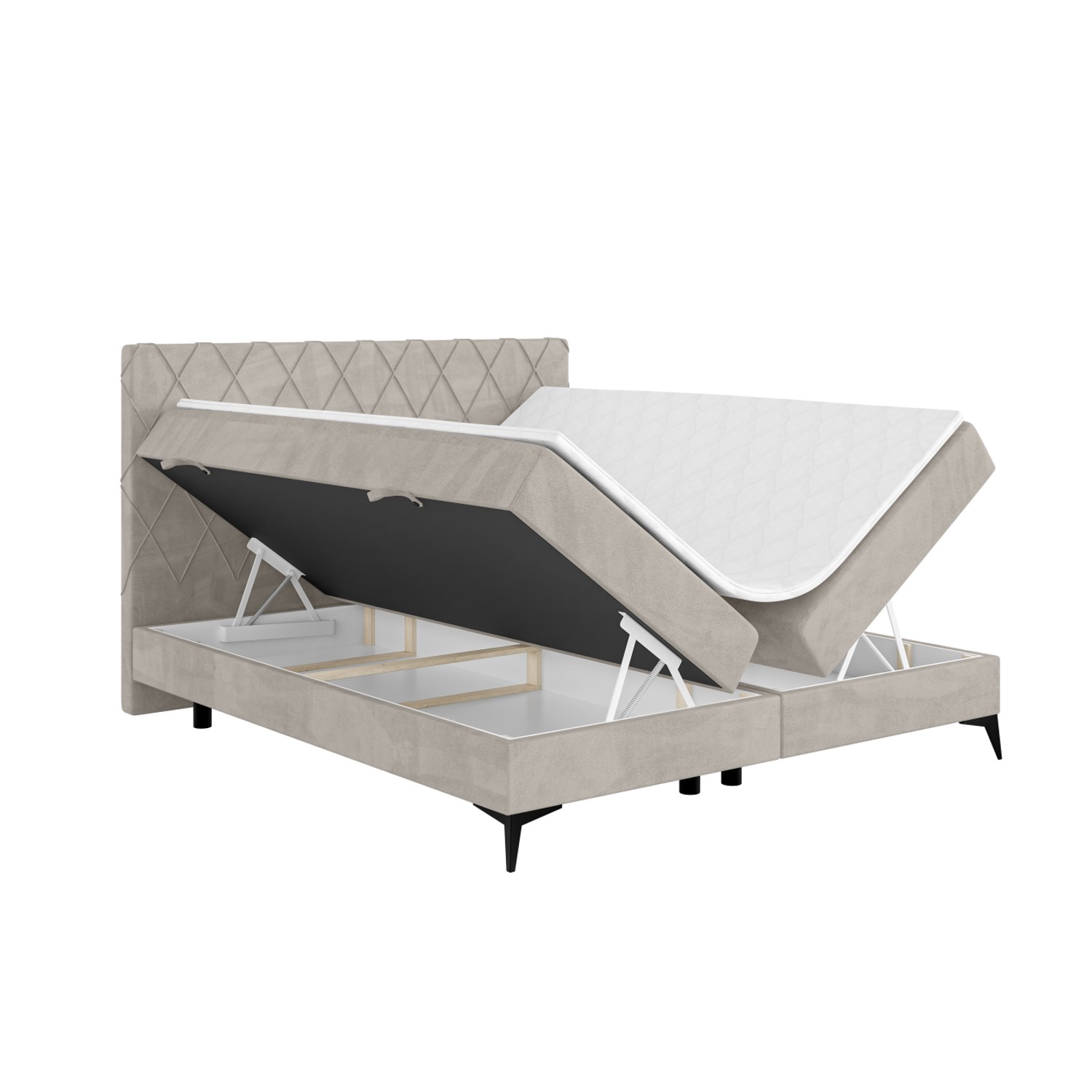 Cauți un pat boxspring 180 x 200 cm modern, confortabil și cu un design atractiv? Modelul Milo bej este alegerea ideală pentru un dormitor elegant și funcțional. Cu o tăblie înaltă tapițată, decorată cu cusături în formă de romb, acest pat boxspring devine rapid piesa centrală a camerei tale.