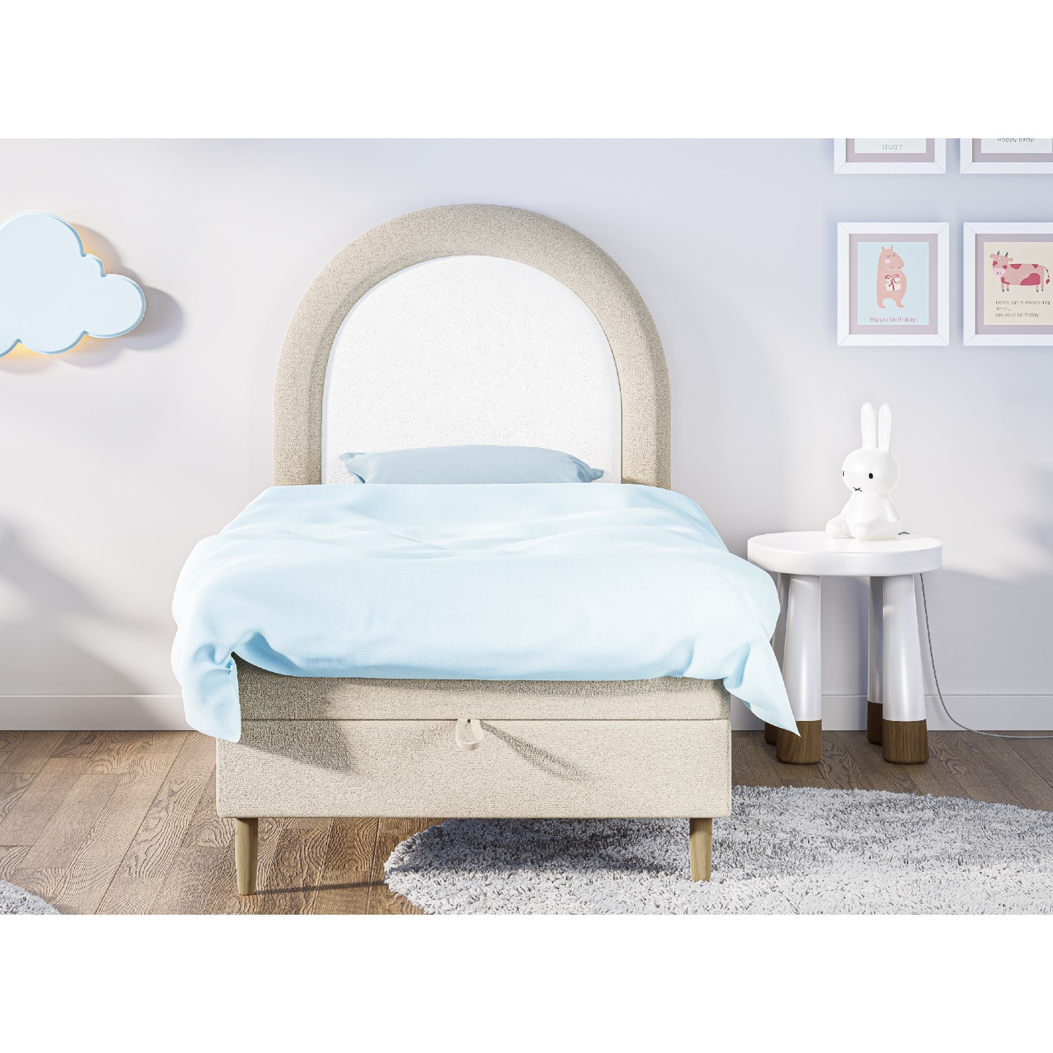 ✔️ Design prietenos pentru camera copilului – tăblie rotunjită în nuanțe de alb și crem