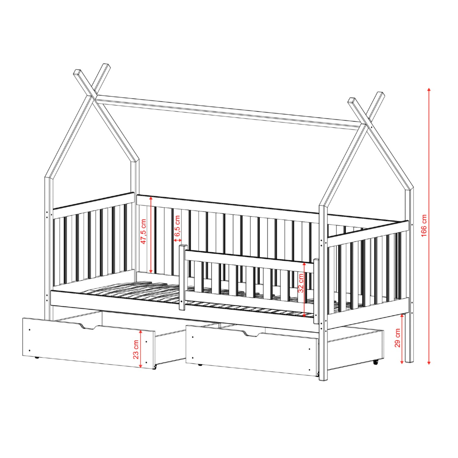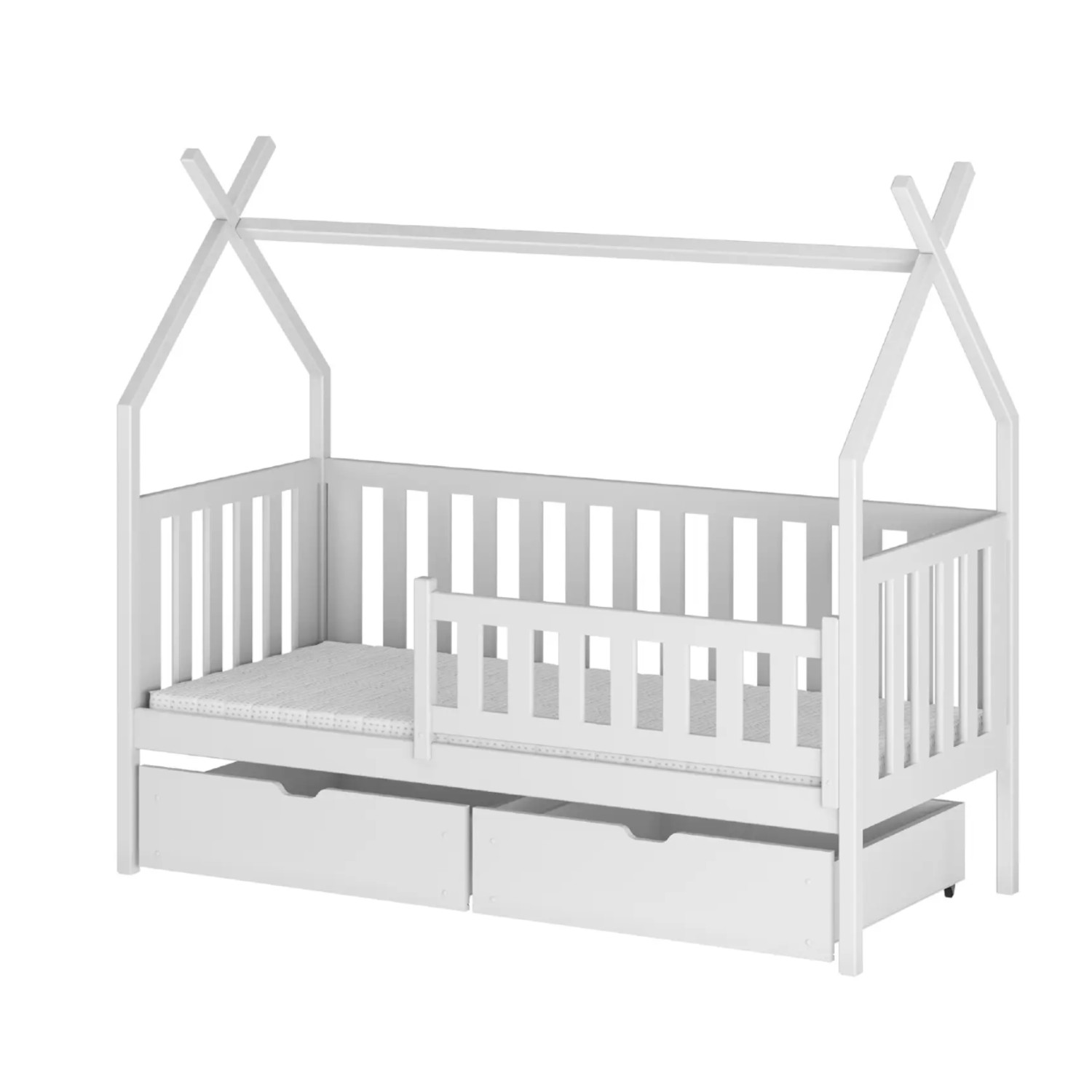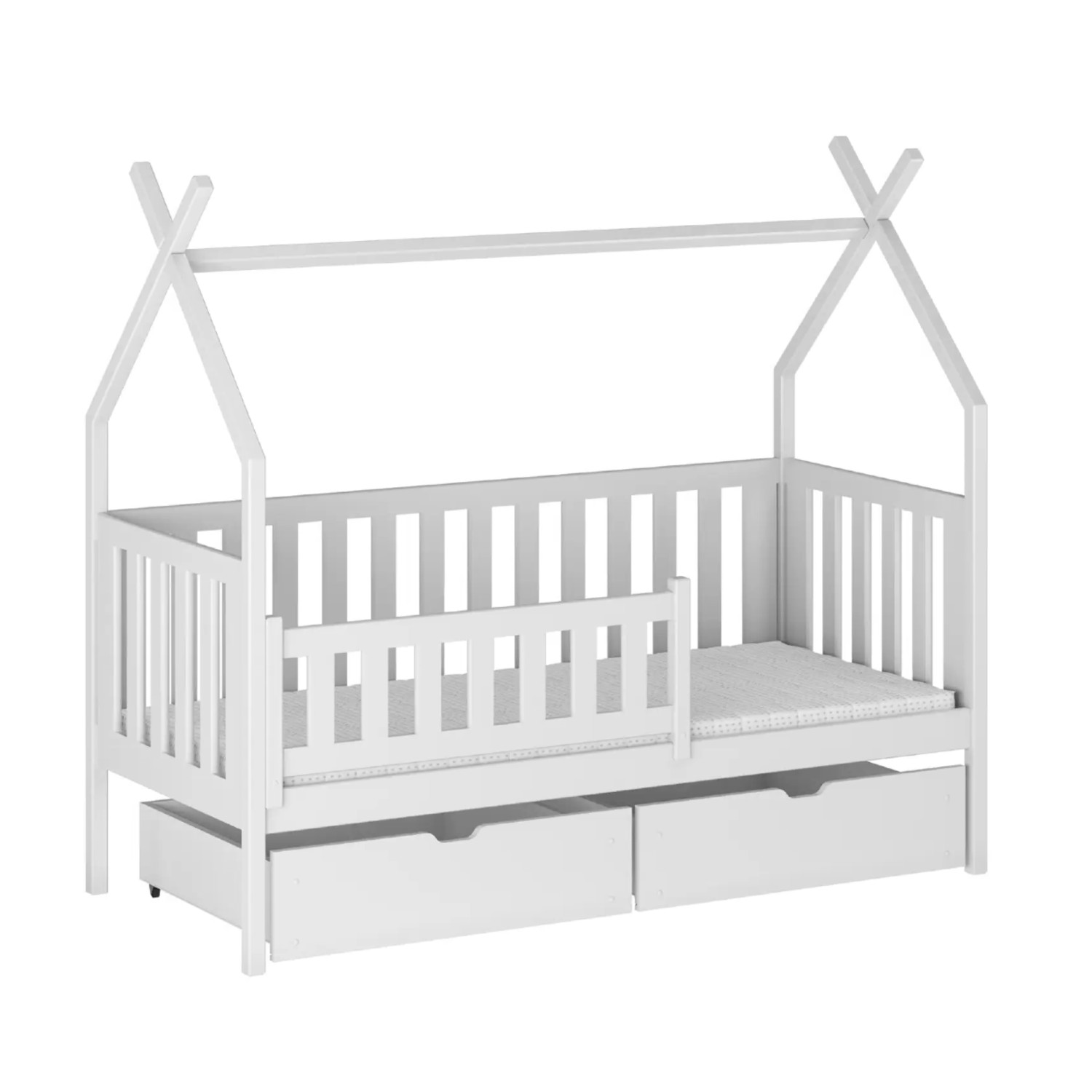 Patul căsuță 90 × 200 cm, din lemn masiv, alb, Simba, realizat din lemn de pin de calitate superioară, este potrivit atât pentru preșcolari, cât și pentru copiii aflați în primii ani de școală. Versiunea cu sertare este extrem de practică și crește odată cu nevoile micuțului. Forma inspirată de un cort transformă încăperea într-un loc magic, unde somnul și joaca se îmbină armonios.
