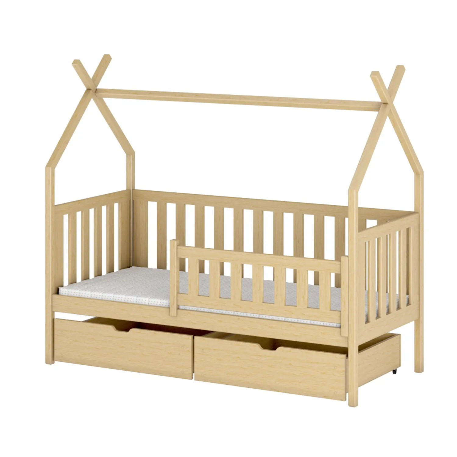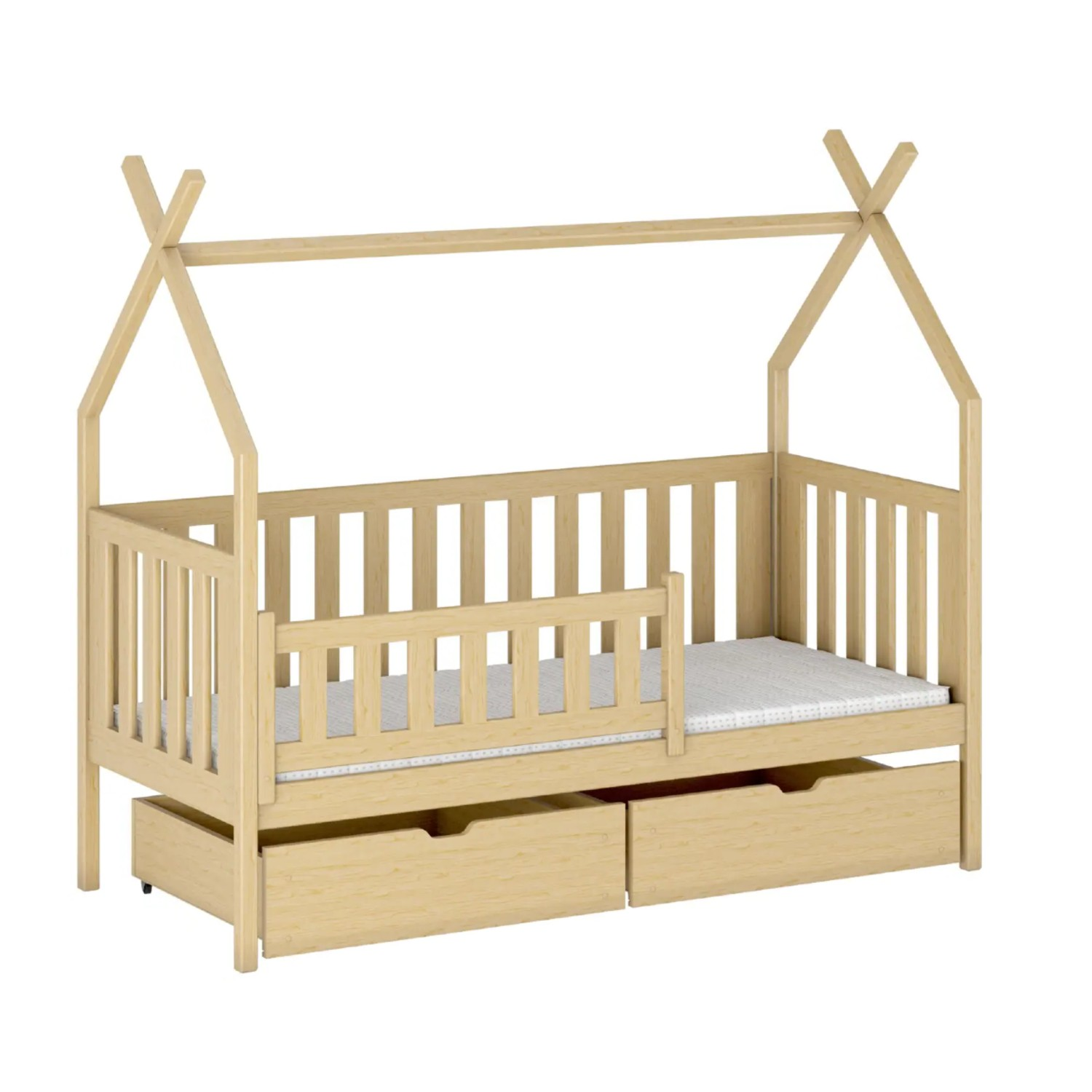 Patul căsuță 90 × 200 cm, din lemn masiv, natur, Simba, realizat din lemn de pin de calitate superioară, este potrivit atât pentru preșcolari, cât și pentru copiii aflați în primii ani de școală. Versiunea cu sertare este extrem de practică și crește odată cu nevoile micuțului. Forma inspirată de un cort transformă încăperea într-un loc magic, unde somnul și joaca se îmbină armonios.