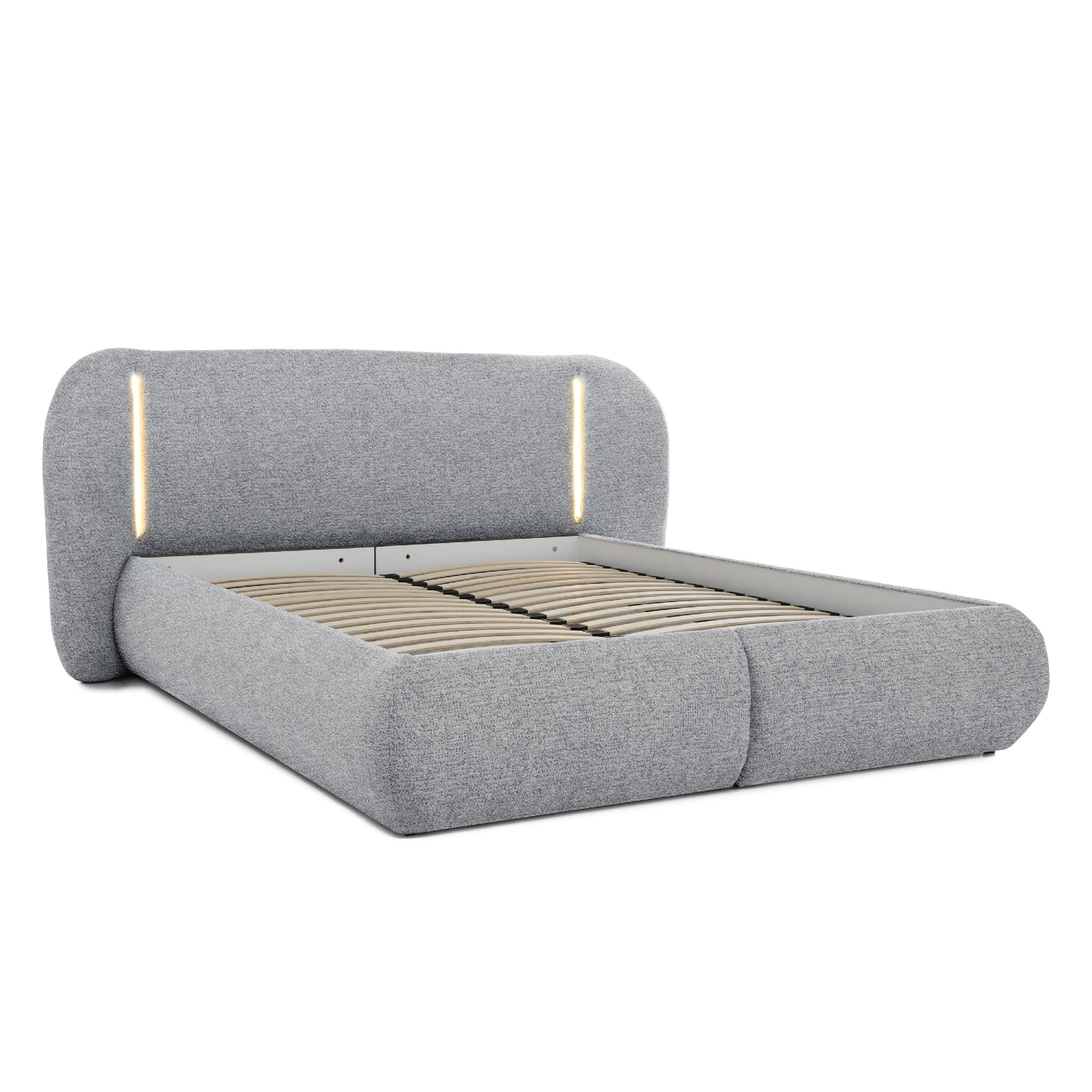 Patul tapitat 180 x 200 cm, cu iluminare, gri deschis Coco este dotat cu un sistem modern de iluminare cu bandă LED integrat în tăblie, oferind lumină ambientală perfectă pentru serile de lectură, momentele de relaxare sau pentru a crea o atmosferă intimă, fără a folosi surse de lumină puternice. LED-ul este eficient energetic și completează perfect designul contemporan al patului.