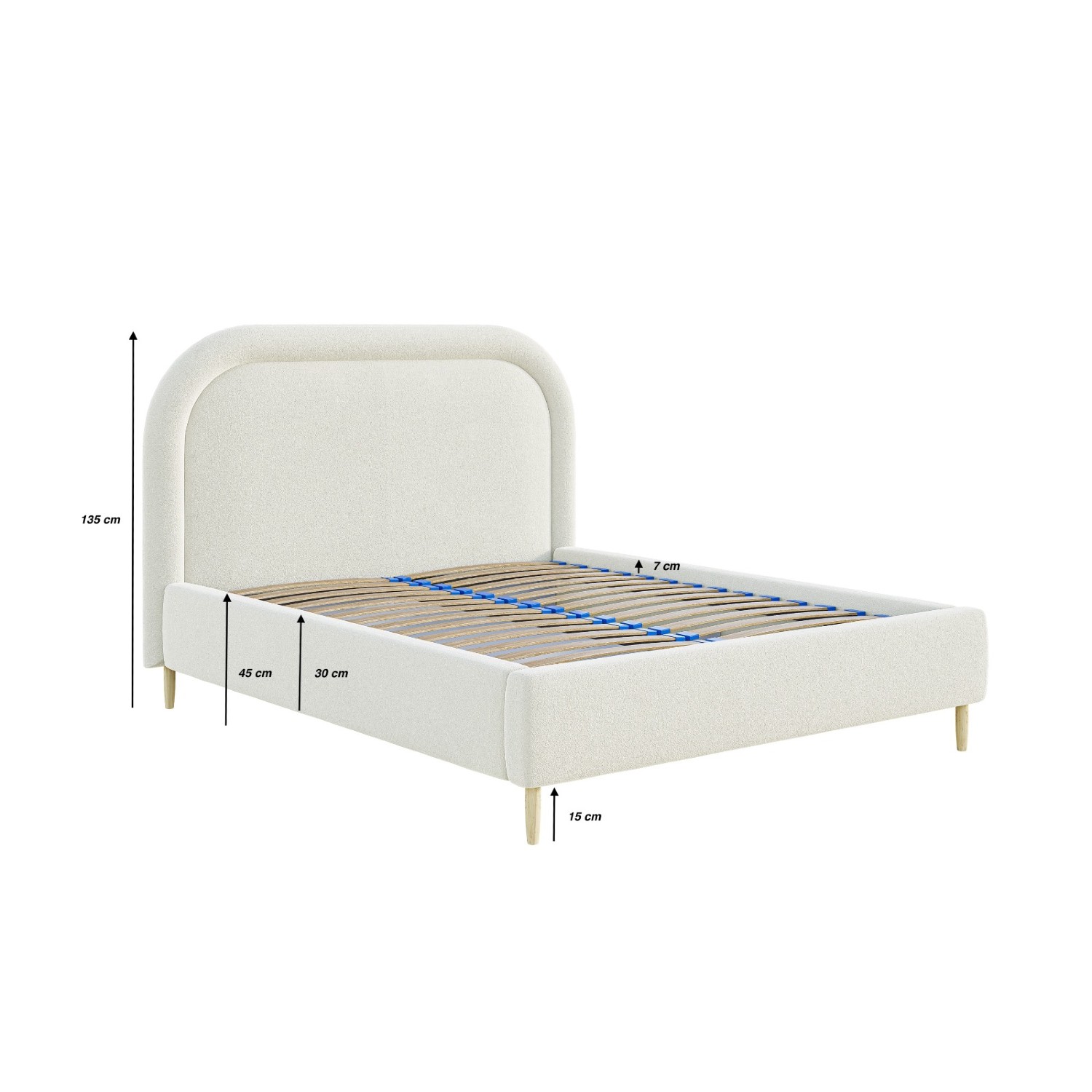Pentru stabilitate și un design natural, patul este prevăzut cu picioare din lemn cu finisaj natur, cu o înălțime de 15 cm. Această înălțime permite curățarea ușoară a pardoselii de sub pat și menținerea unui spațiu igienic în dormitor.