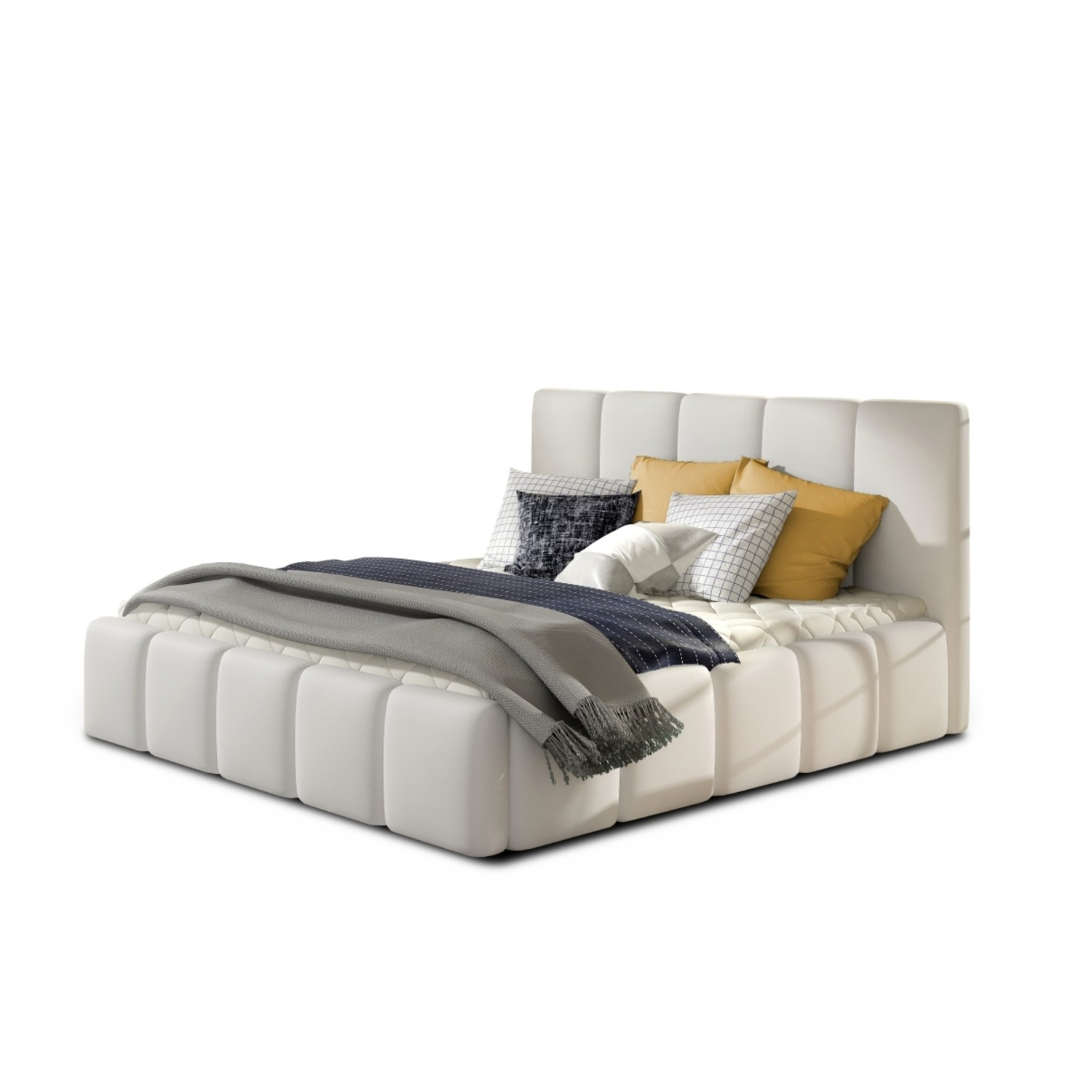 Patul tapițat cu somieră rabatabilă 140 x 200 cm alb Erica o alegere bună pentru un dormitor elegant, datorită stilul său extrem de rafinat. Designul modern, care adaugă rafinament, face din patul Erica cel mai popular model al nostru pentru cei care caută dormitoare elegante și confortabile. Stilul este pur și simplu încântător, cu tăblia înaltă și panourile laterale ale cadrului căptușite cu spumă de tapițerie, fiecare împărțit în secțiuni prin cusături verticale cu accente orizontale de tufting tipice designului eclectic și elegant. Textilul de calitate care acoperă patul (Soft 17) este confortabil, rezistent la uzură și își păstrează frumusețea timp îndelungat.