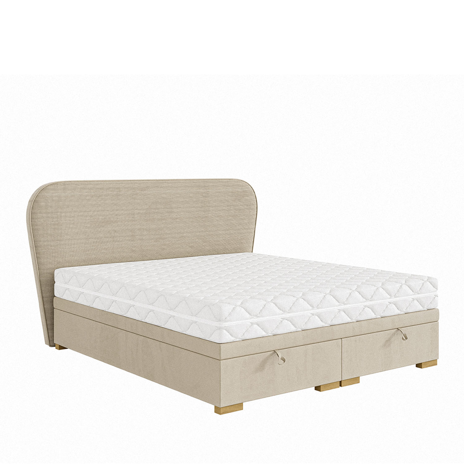 Patul tapițat Bodema impresionează prin tăblia înaltă, rotunjită și matlasată, care oferă un plus de confort și susținere. Tapițeria din material textil, plăcută la atingere, contribuie la crearea unei atmosfere calde și primitoare în dormitor.