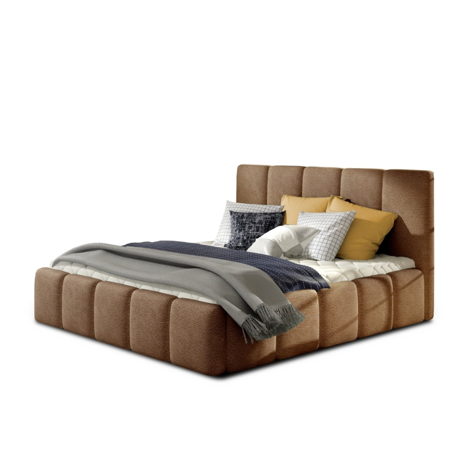 Patul tapițat cu somieră rabatabilă 140 x 200 cm maro deschis Erica o alegere bună pentru un dormitor elegant, datorită stilul său extrem de rafinat. Designul modern, care adaugă rafinament, face din patul Erica cel mai popular model al nostru pentru cei care caută dormitoare elegante și confortabile. Stilul este pur și simplu încântător, cu tăblia înaltă și panourile laterale ale cadrului căptușite cu spumă de tapițerie, fiecare împărțit în secțiuni prin cusături verticale cu accente orizontale de tufting tipice designului eclectic și elegant. Textilul de calitate care acoperă patul (Dora 26) este confortabil, razistent la uzură și își păstrează frumusețea timp îndelungat.