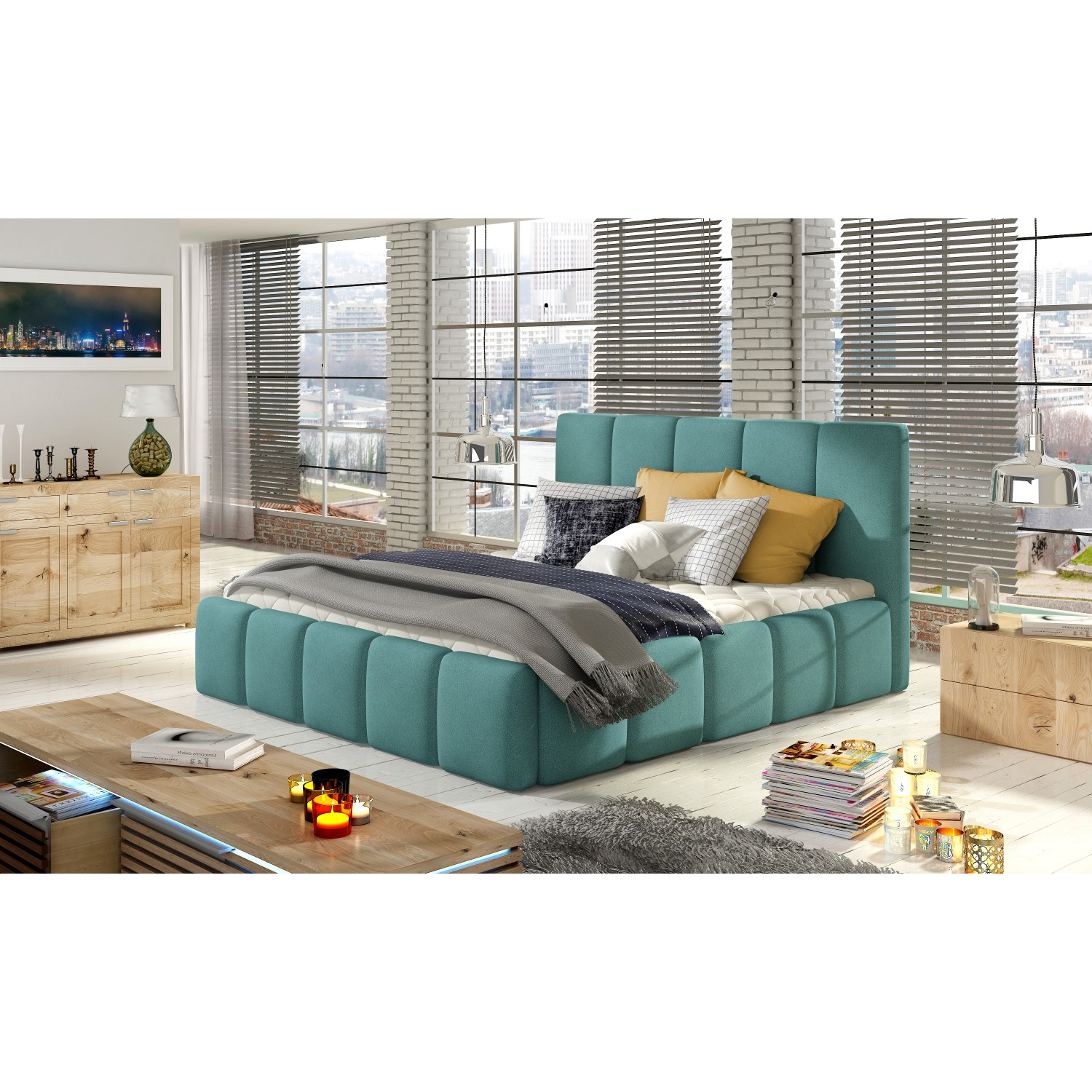 Patul tapițat cu somieră rabatabilă 160 x 200 cm albastru Erica o alegere bună pentru un dormitor elegant, datorită stilul său extrem de rafinat. Designul modern, care adaugă rafinament, face din patul Erica cel mai popular model al nostru pentru cei care caută dormitoare elegante și confortabile. Stilul este pur și simplu încântător, cu tăblia înaltă și panourile laterale ale cadrului căptușite cu spumă de tapițerie, fiecare împărțit în secțiuni prin cusături verticale cu accente orizontale de tufting tipice designului eclectic și elegant. Textilul de calitate care acoperă patul (Ontario 83) este confortabil, rezistent la uzură și își păstrează frumusețea timp îndelungat.