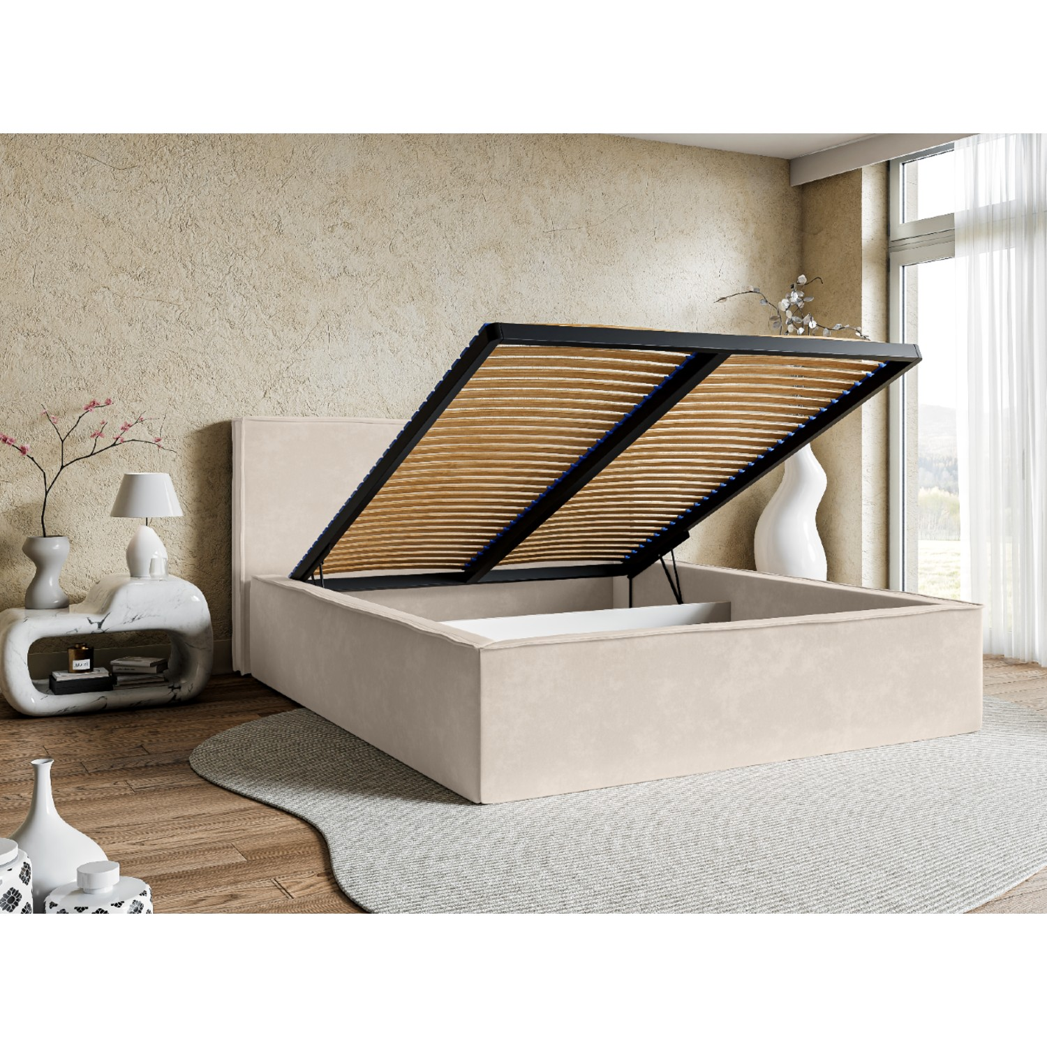 Patul tapitat 160x200 cm bej Velvet cu somieră rabatabilă și ladă de depozitare este alegerea ideală pentru un dormitor modern, elegant și funcțional. Designul clasic, evidențiat prin linii drepte și finisaje rafinate, se integrează ușor în orice stil de amenajare, de la minimalist la contemporan.