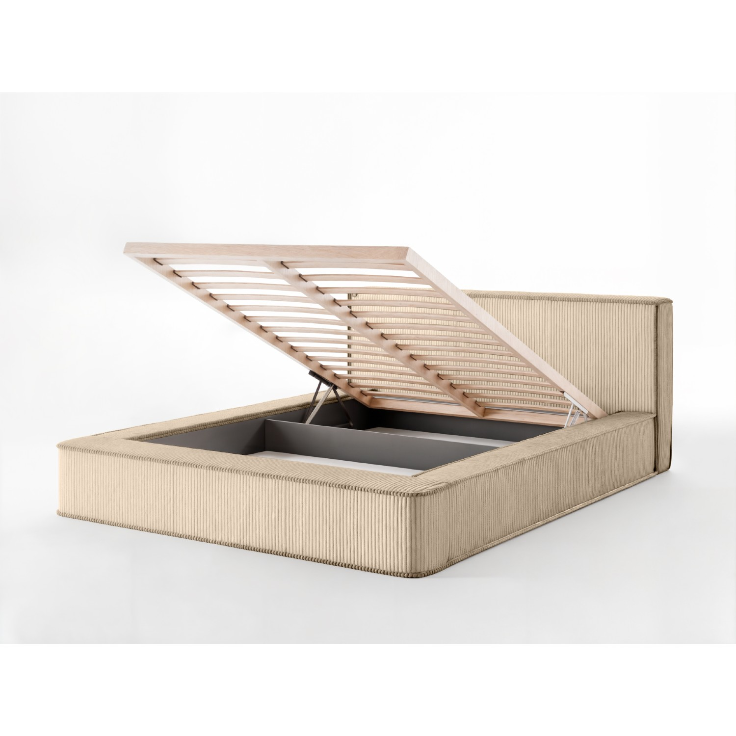 Un punct forte al acestui pat 160x200 cu ladă de depozitare este spațiul generos aflat sub somieră. Acesta este împărțit în două compartimente și este ușor accesibil datorită sistemului de ridicare cu arc. Somiera rabatabilă, realizată din lamele de fag, asigură susținere optimă pentru saltea.