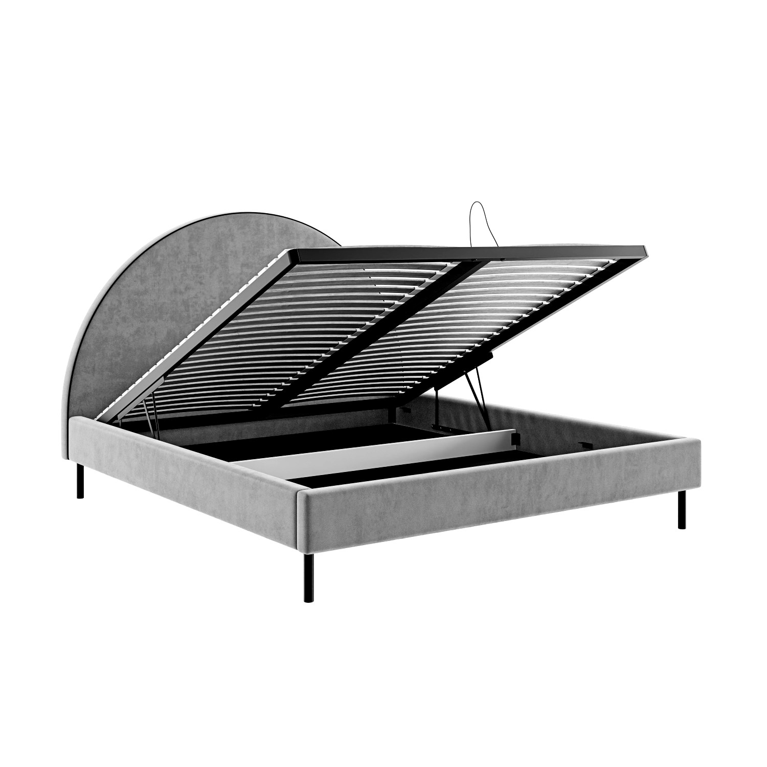 Patul tapițat cu somieră rabatabilă 160 x 200 cm gri bej Moon este realizat pe o structură solidă din lemn și este prevăzut cu o ladă de depozitare împărțită în două compartimente, accesibilă prin ridicarea somierei din partea din față a patului. Somiera metalică este echipată cu câte 24 de lamele flexibile din lemn pe fiecare parte, menite să sporească confortul saltelei. Mecanismul de deschidere al somierei este proiectat pentru a fi foarte ușor de manevrat, asigurând acces facil la spațiul de depozitare.