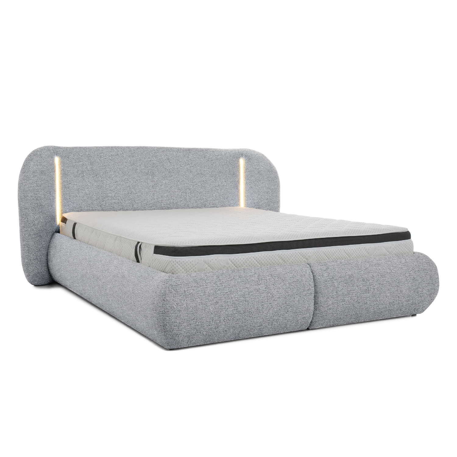 Patul tapitat 160 x 200 cm, cu iluminare, gri deschis Coco este un mobilier premium, creat pentru a oferi dormitorului tău un aer modern, elegant și extrem de confortabil. Designul său se remarcă prin tăblia impunătoare, realizată cu forme rotunjite și proporții generoase, care adaugă un plus de rafinament și creează un punct vizual central în încăpere. Tapiteria chenille, un tip de catifea structurată, într-o nuanță caldă de gri deschis (Bella 65) conferă o atmosferă relaxantă, fiind ușor de integrat în diverse stiluri de amenajare – de la contemporan și minimalist, până la modern-luxury.