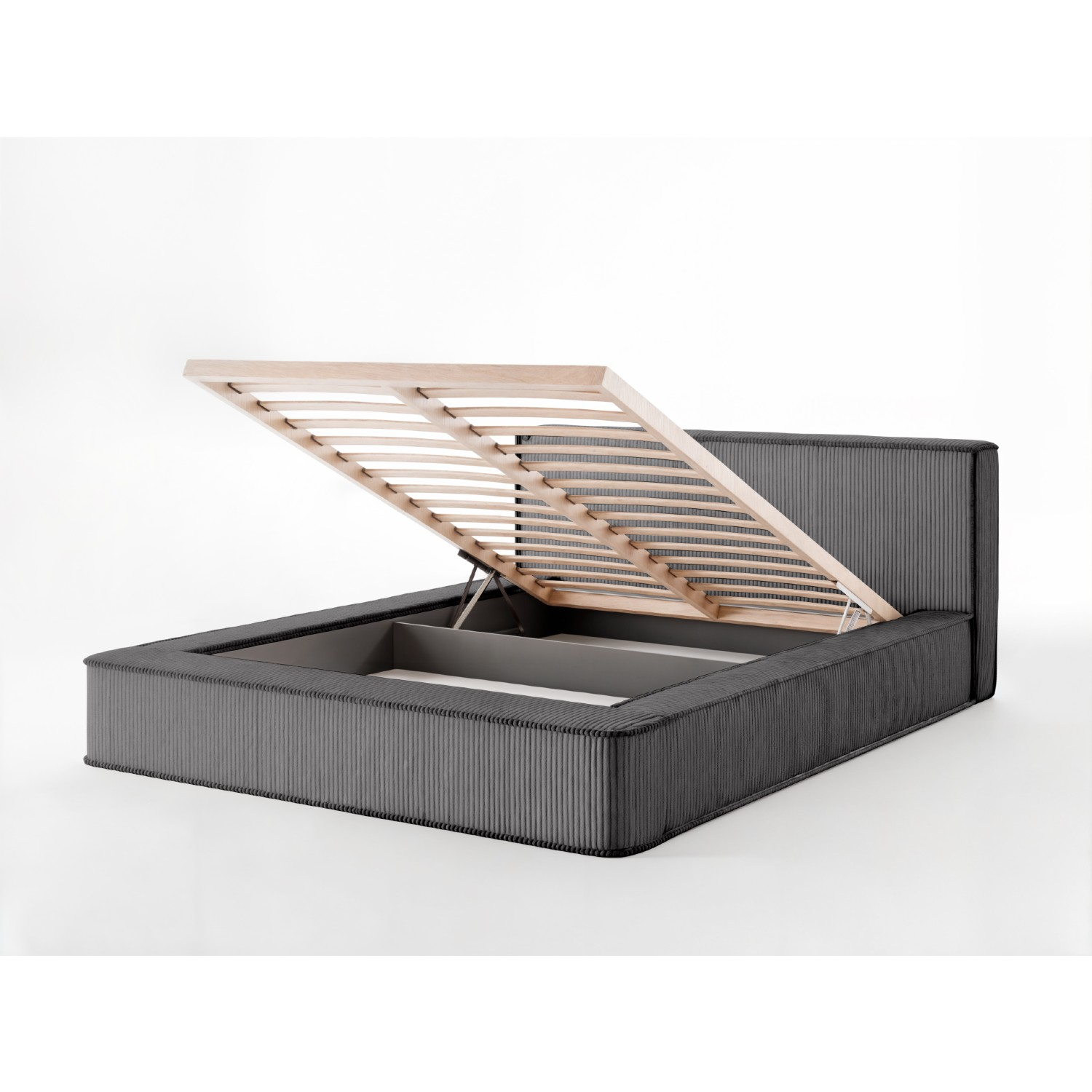 Un punct forte al acestui pat 160x200 cu ladă de depozitare este spațiul generos aflat sub somieră. Acesta este împărțit în două compartimente și este ușor accesibil datorită sistemului de ridicare cu arc. Somiera rabatabilă, realizată din lamele de fag, asigură susținere optimă pentru saltea.