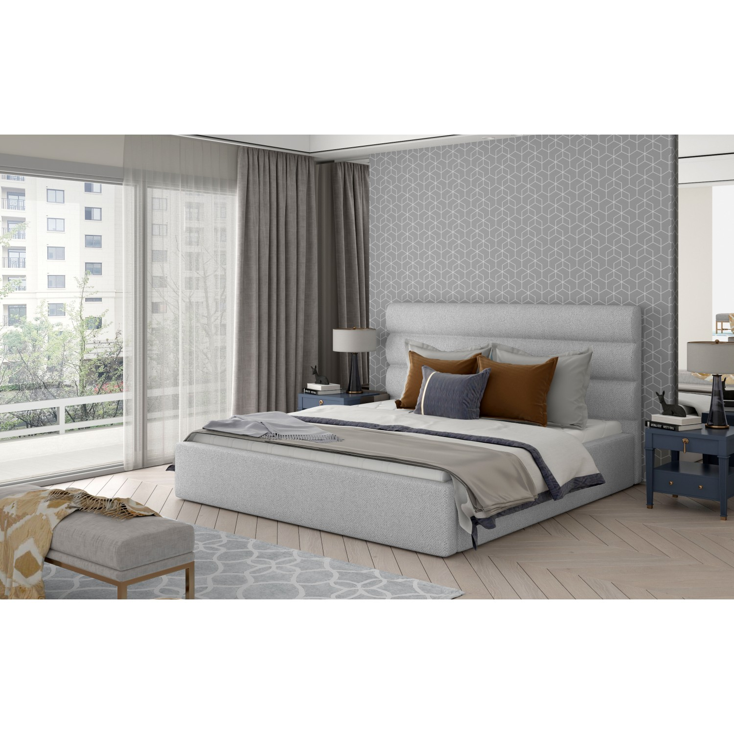 Patul tapițat cu somieră rabatabilă 180 x 200 cm gri deschis Camel este prevăzut cu o somieră metalică rabatabilă cu sistem de ridicare cu piston cu gaz și un spațiu generos de depozitare, ideal pentru așternuturi, perne sau alte accesorii. Sistemul de ridicare cu piston pe gaz face utilizarea zilnică ușoară și comodă.