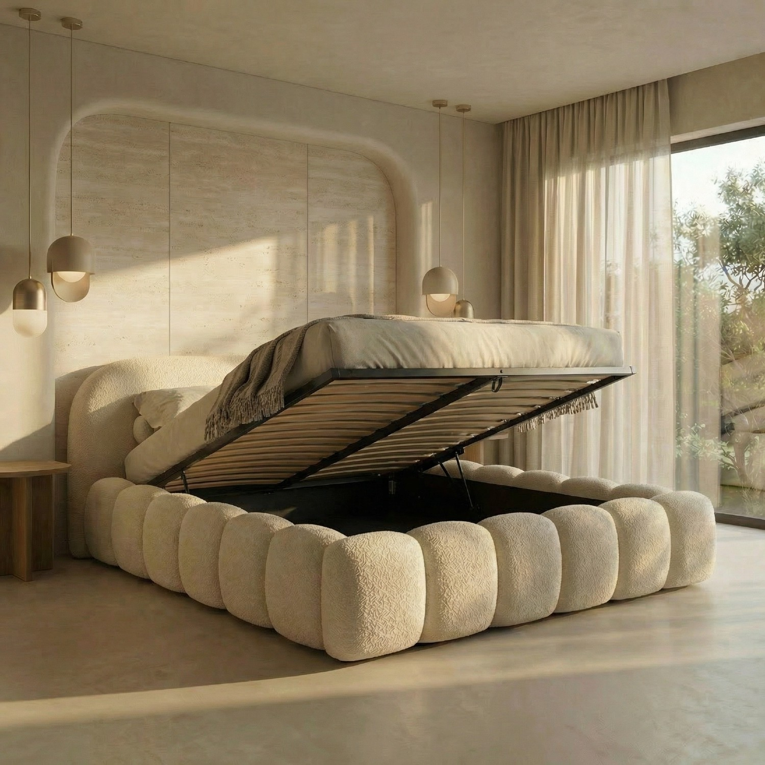 Sub somieră se află un compartiment încăpător, bine structurat, susținut de o bază solidă, care contribuie la menținerea ordinii fără a fi nevoie de mobilier suplimentar. Construcția robustă a cadrului asigură stabilitate și durabilitate în timp. Necesită saltea cu dimensiuni recomandate de 200 x 200 cm.