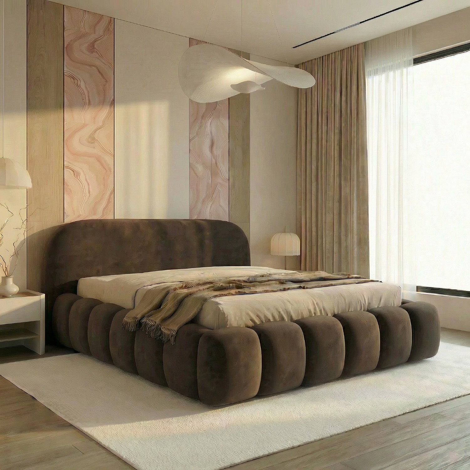 Patul tapițat cu somieră rabatabilă 200x200 cm maro Orlando Slim impresionează printr-un design contemporan, cu linii fluide și forme rotunjite, care creează o atmosferă calmă și elegantă în dormitor. Tăblia generoasă, ușor curbată, devine punctul central al încăperii și oferă un sprijin confortabil pentru momentele de relaxare.
