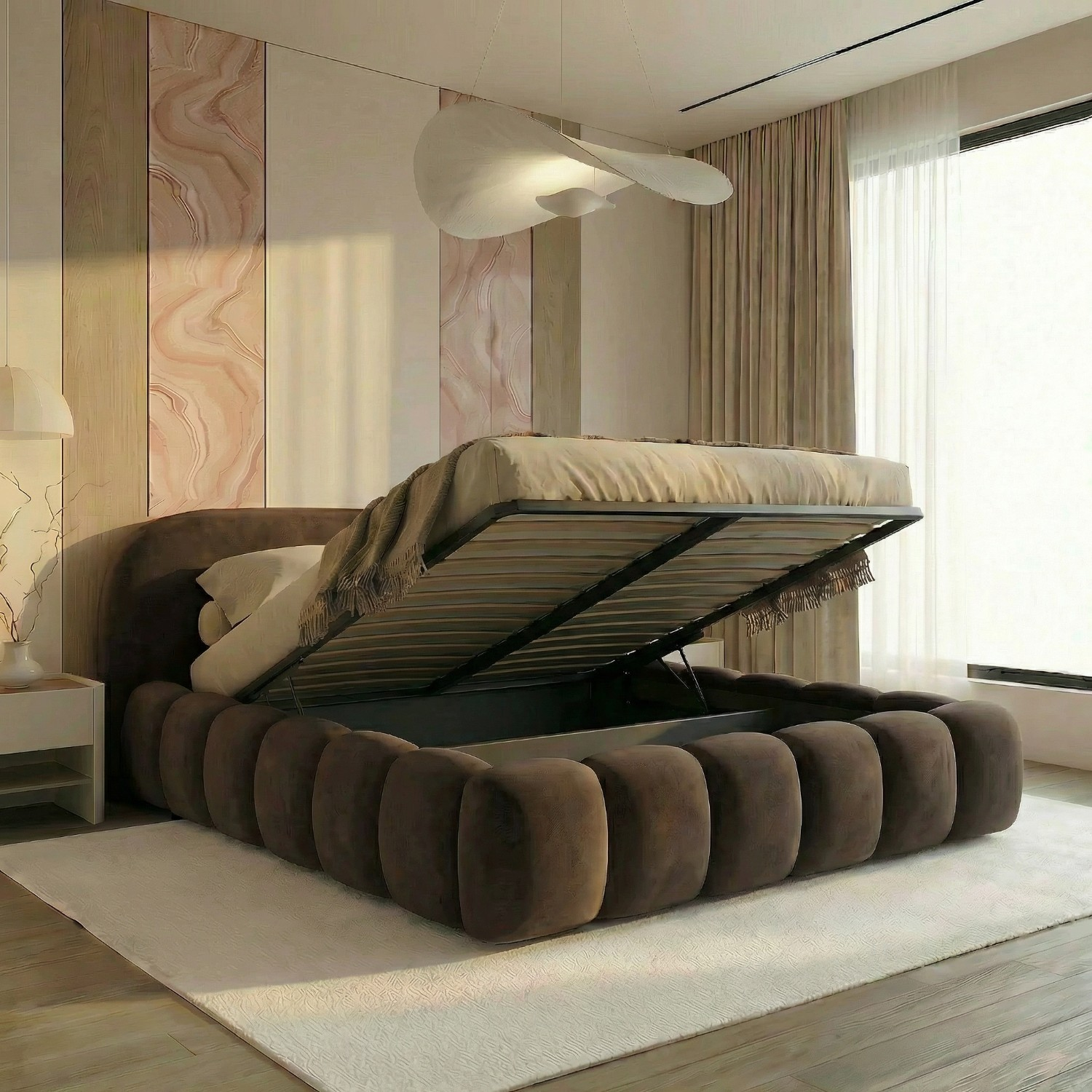 Patul tapițat cu somieră rabatabilă 200x200 cm maro Orlando Slim este prevăzut cu o somieră concepută pentru a oferi susținere optimă saltelei și un confort ridicat în timpul somnului. Sistemul de ridicare asistat permite accesul rapid la spațiul de depozitare amplasat dedesubt, ideal pentru organizarea eficientă a lenjeriilor sau altor obiecte.