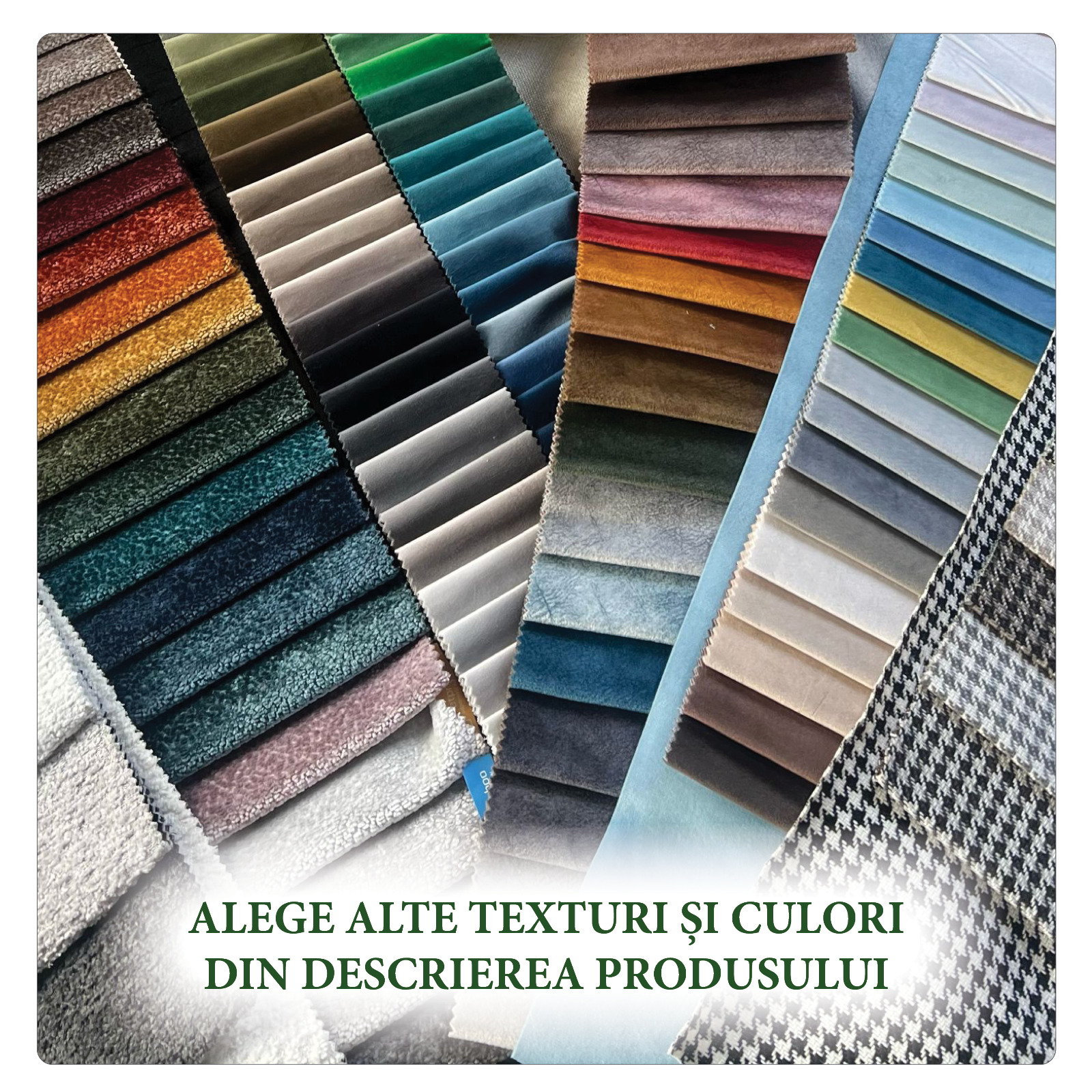 Produsul poate fi comandat și cu alte culori de tapițerie, alegând dintre variantele prezentate în linkul cu textile, pe care îl găsiți apăsând CLICK pe imaginea de mai jos, sau cu alte finisaje pentru picior, alegând dintre variantele din secțiunea de imagini.