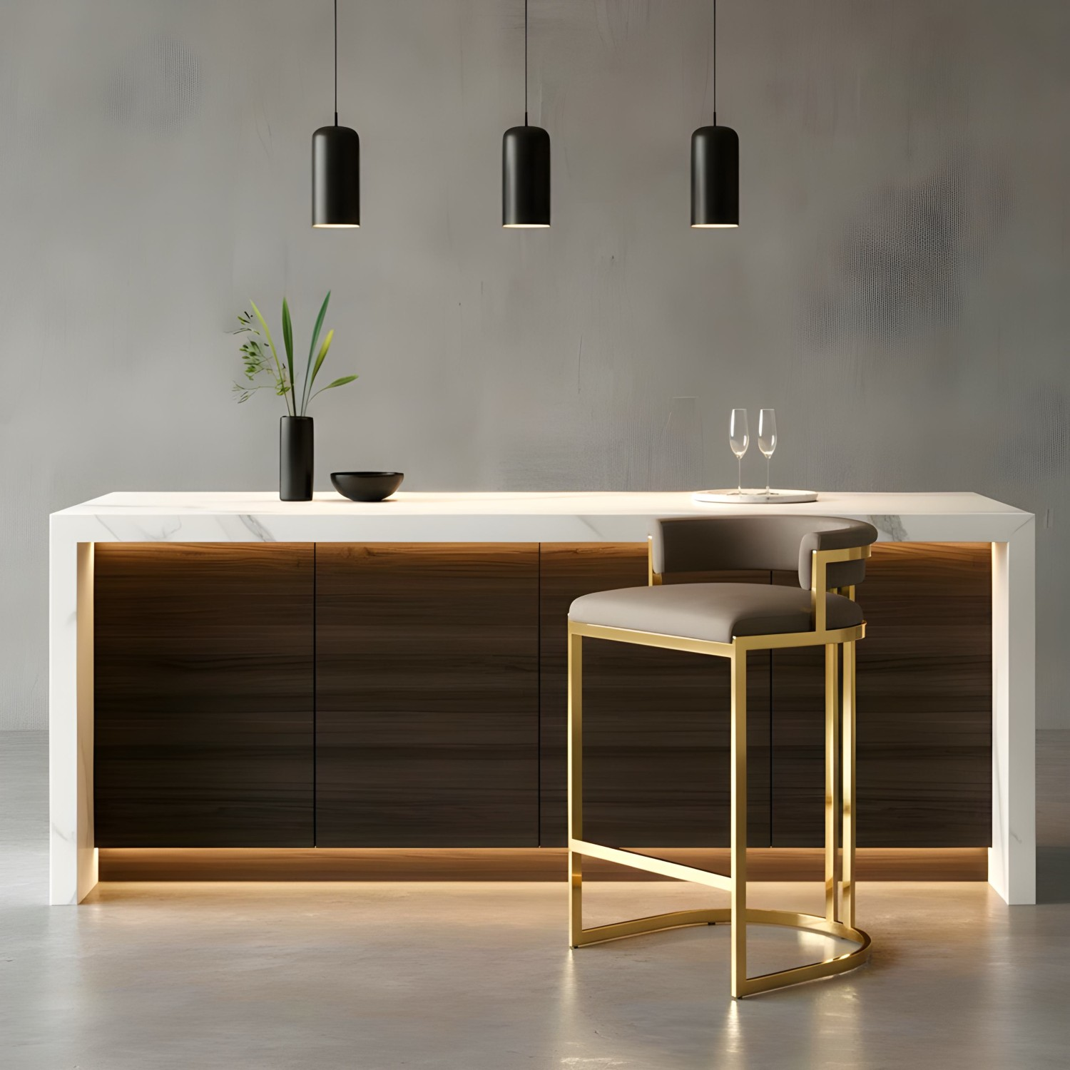 Scaunul de bar tapitat maro deschis/auriu Vegas 60 este o aparitie electrizanta, care insufleteste orice tip de decor. Eleganta liniilor rotunjite, textilul de calitate si finisajul auriu al picioarelor face ca acest scaun de bar sa fie nelipsit intr-o ambianta moderna. Spatarul mic pentru club in combinatie cu un picior subtire din metal ofera un efect vizual deosebit. Scaunul de bar tapitat maro deschis/auriu Vegas 60 are picioare realizate din metal cromat cu auriu, care ii asigura stabilitatea si rezistenta.
