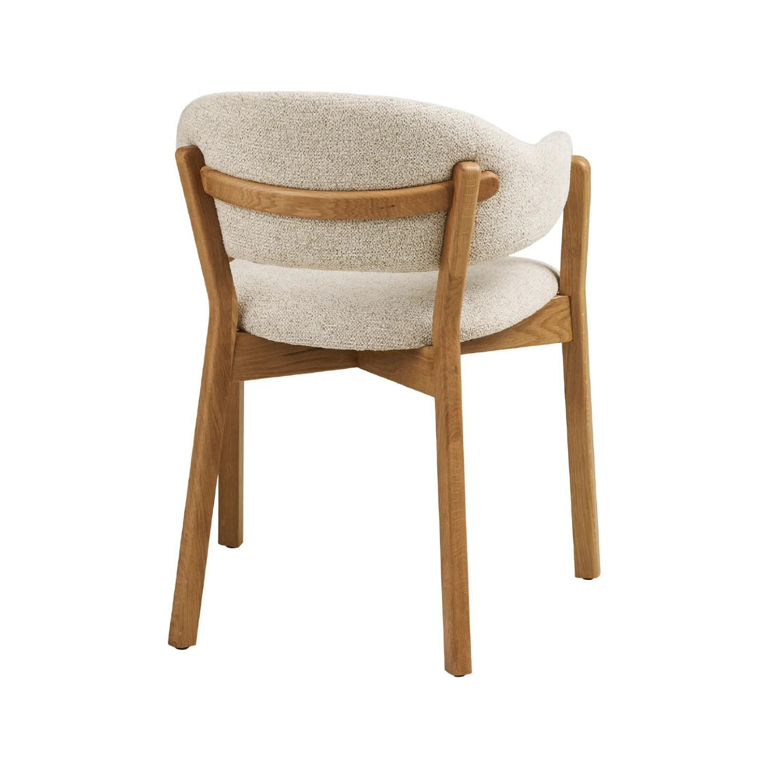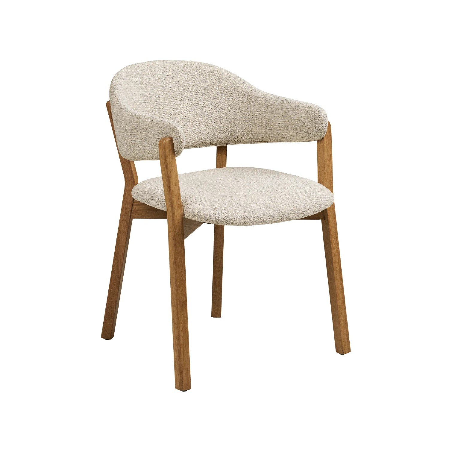 Ideal pentru sufragerie, birou sau spații HoReCa, scaunul din lemn cu brațe, tapițat, bej/stejar Dune combină armonios funcționalitatea, confortul și eleganța naturală a lemnului de stejar.