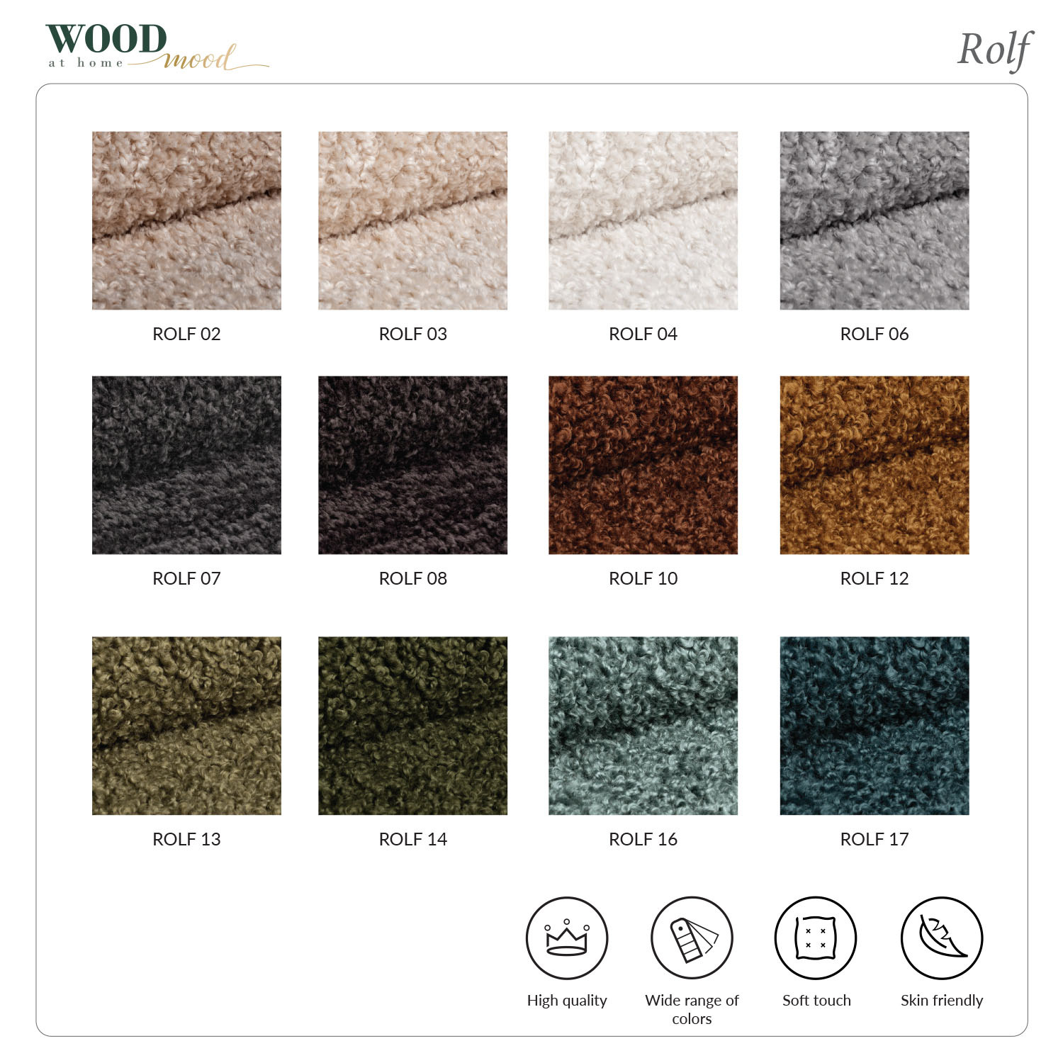 ✔️ Tapițerie bouclé (Rolf 03) rezistentă și plăcută la atingere, într-o culoare versatilă; țesătura cu greutate 550 g/m2, test Martindale >100 000