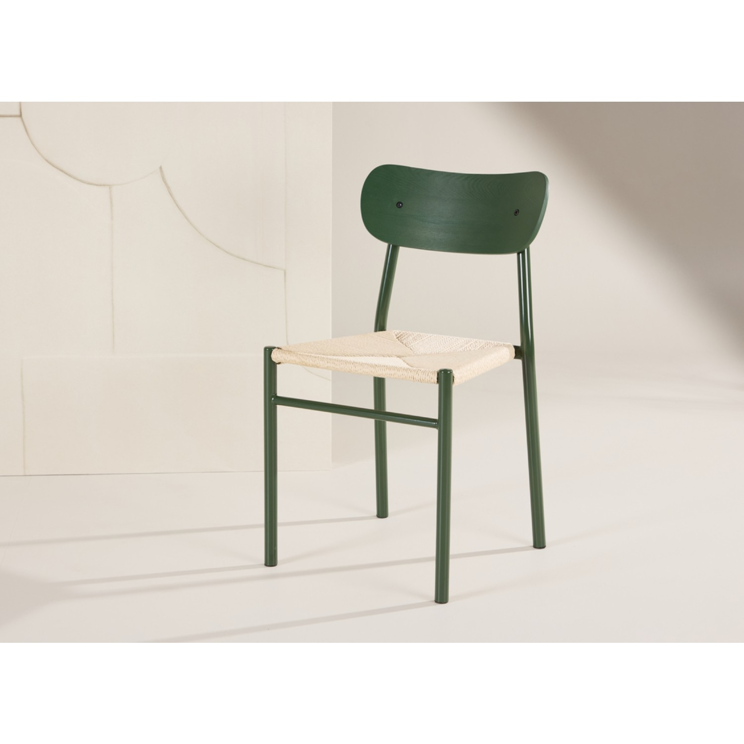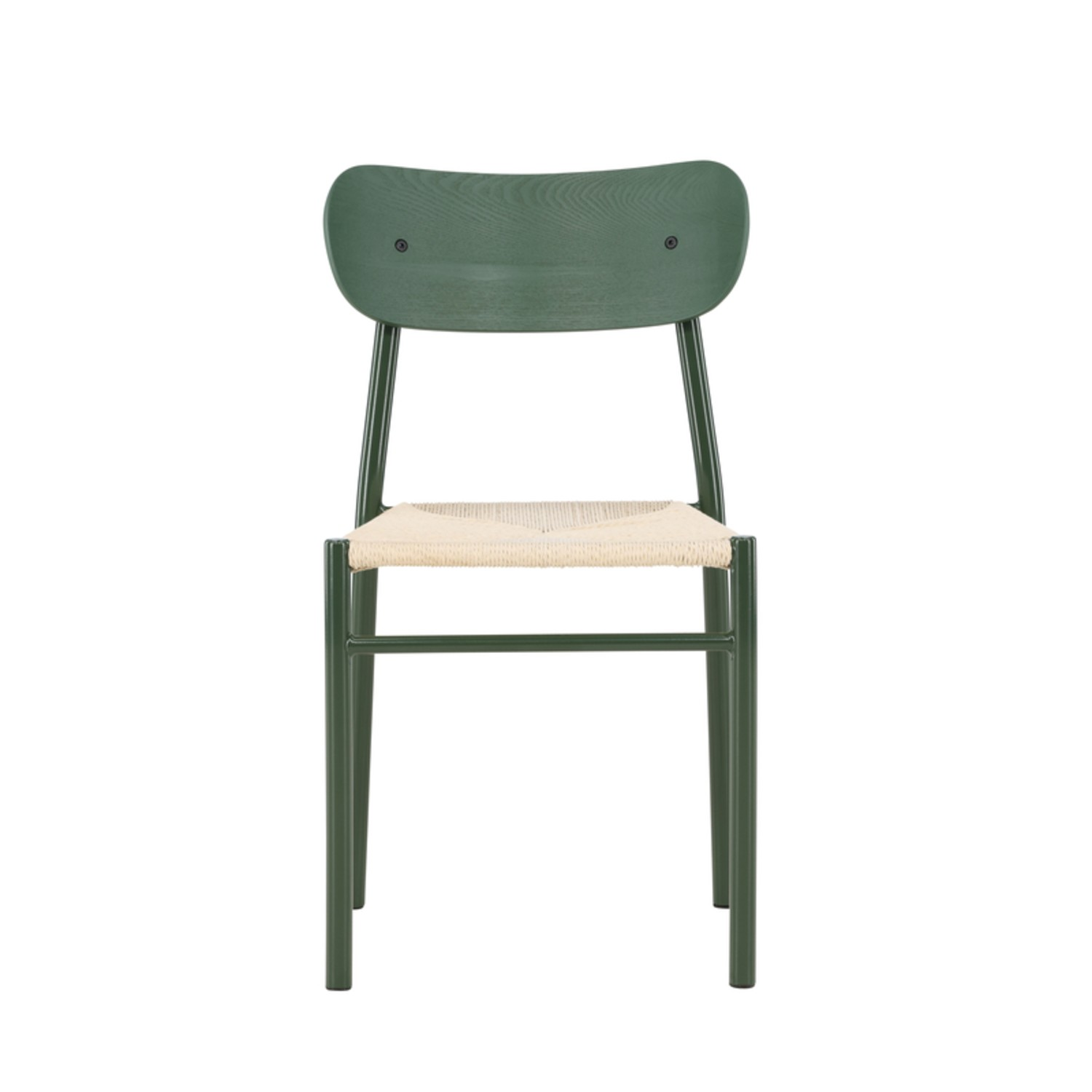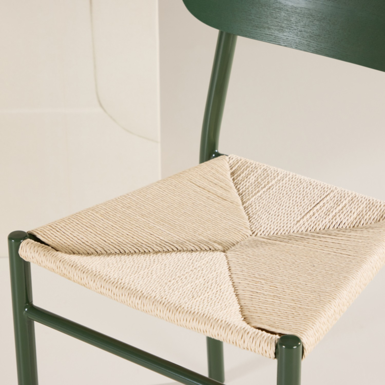 Structura și picioarele scaunului sunt confecționate din metal rezistent, vopsit în culoarea verde, ceea ce garantează stabilitate și durabilitate în timp, fără a compromite eleganța designului. Fie că îl folosești pentru mesele zilnice în familie sau pentru momente speciale alături de oaspeți, scaunul de dining metalic verde/natur Polly se va remarca prin confort și stil.