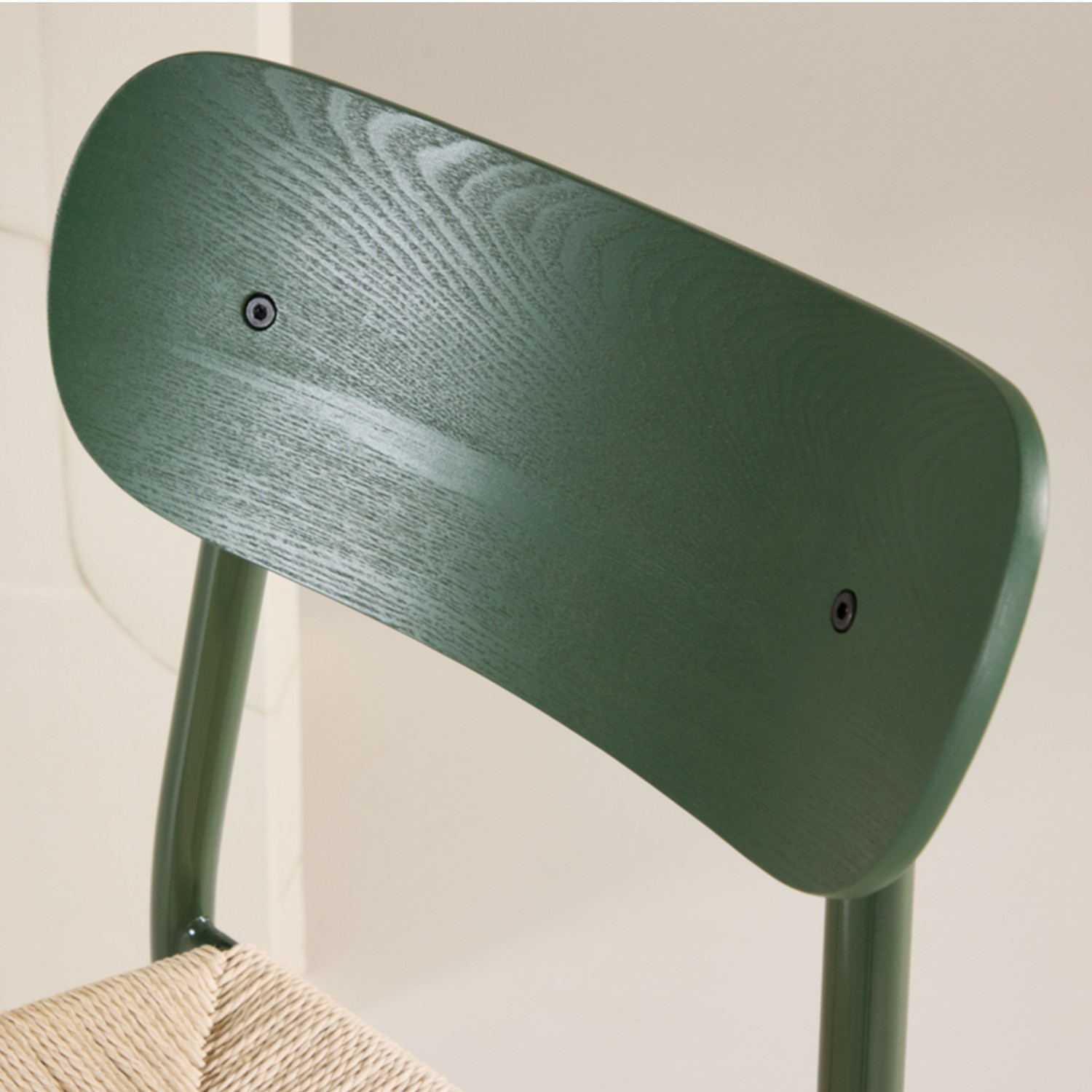 ✔️ Combinație armonioasă între spătarul finisat verde și șezutul din ratan natural.