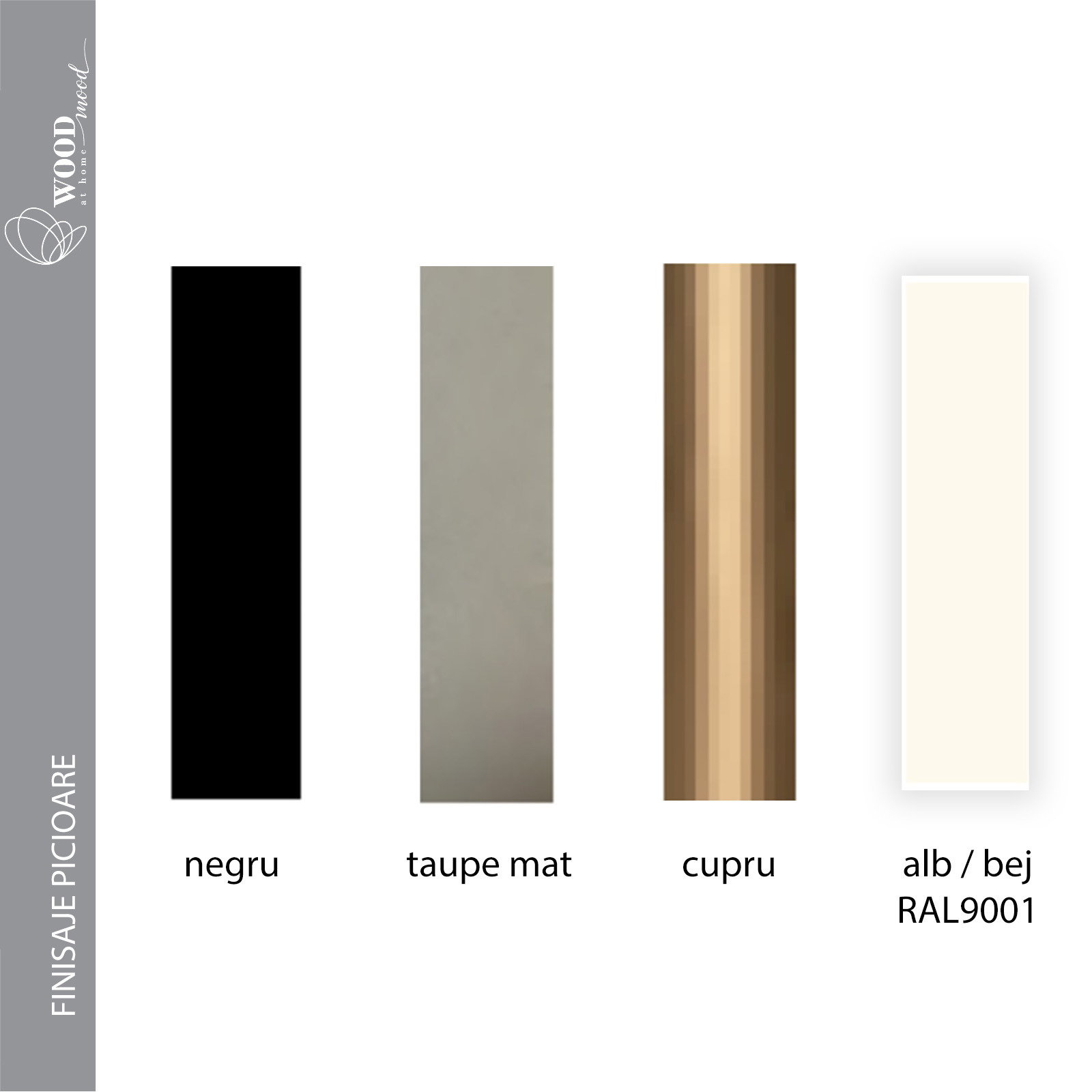 NOTA: Produsul poate fi comandat si alte finisaje pentru picioare sau alte culori de tapiterie alegand dintre variantele prezentate la sectiunea de imagini. Alegerile dvs. va rugam sa le precizati in rubrica Observatii din fisa de comanda online. Pentru o alegere personalizata, va punem la dispozitie mostrarul cu textile pe care vi-l trimitem gratuit la adresa. Nuanta tapiteriei din imaginea de prezentare a produsului poate fi usor diferita fata de cea din realitate, mai inchisa sau mai deschisa, in functie de expunerea la lumina a produsului in momentul fotografierii.