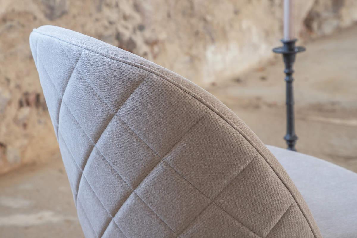 Spătarul este rotunjit și, la fel ca șezutul, este tapițat ușor cu textil bej închis, cu cusături decorative.