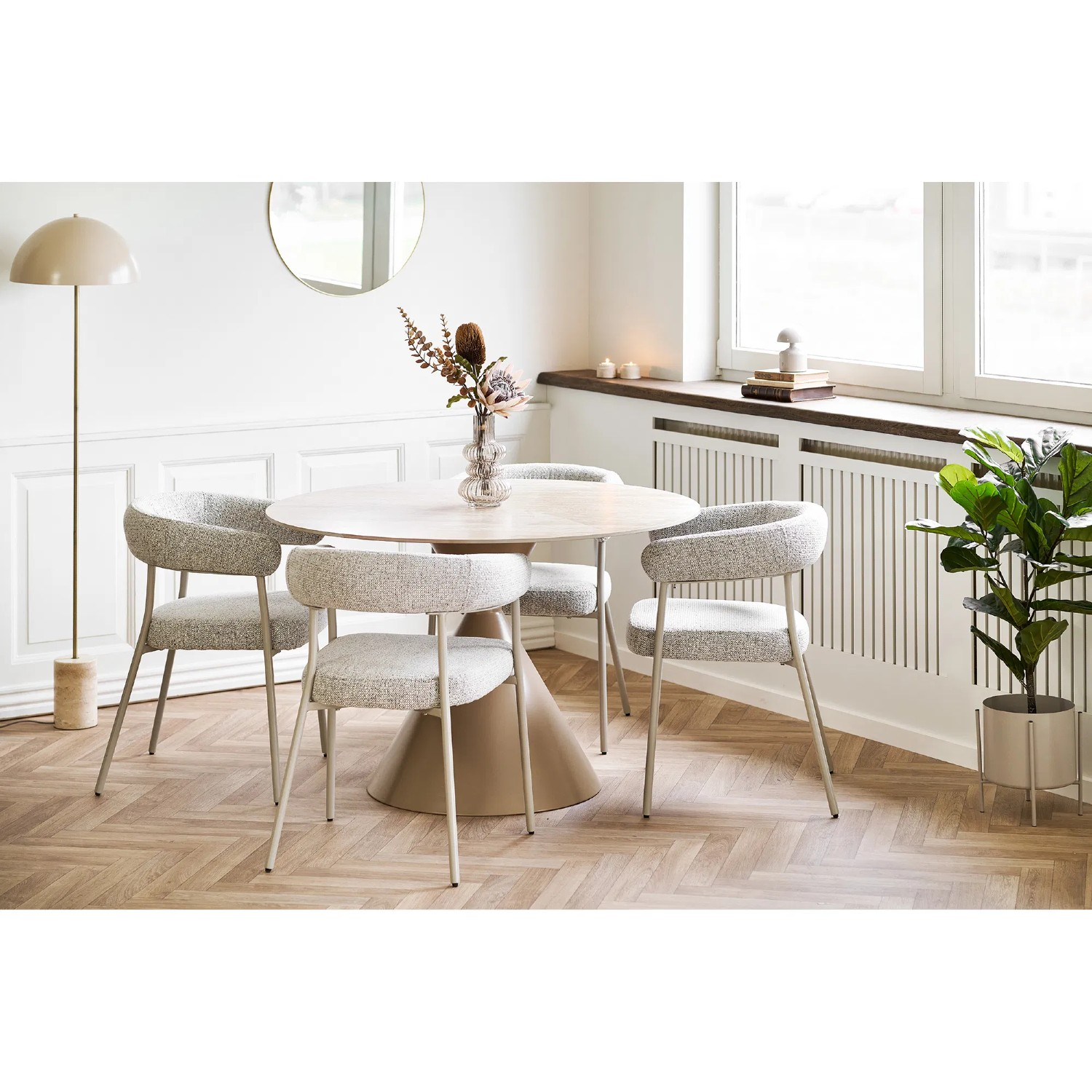 Adaugă un plus de rafinament locuinței tale cu scaunul tapitat cu brate sand/gri casmir Trivio, modern, ideal pentru living, dining sau birou. Scaunul tapitat cu brate sand/gri casmir Trivio este conceput cu un design curbat și minimalist, completat de o tapițerie texturată de culoare deschisă, plăcută la atingere, care oferă confort și stil. Structura solidă cu picioare din metal vopsit in culoare gri cașmir asigură stabilitate și durabilitate în timp, fără a compromite estetica. Spătarul curbat și brațele integrate oferă susținere optimă pentru o postură relaxată, făcându-l ideal atât pentru utilizare zilnică, cât și pentru întâlniri sau cine prelungite. Șezutul cu umplutură cu spumă de tapițerie este confortabil, făcând din șederea prelungită o adevărată încântare. Înfrumusetează-ți încăperea cu scaunul tapitat cu brate sand/gri casmir Trivio adăugând acest scaun modern în decorul casei tale!