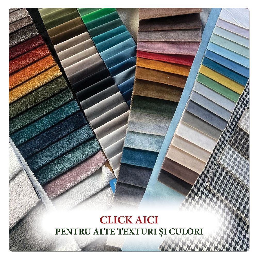 Produsul poate fi comandat și cu alte texturi și culori de tapițerie alegând dintre variantele prezentate în linkul cu textile pe care îl găsiți apăsând CLICK pe imaginea de mai jos sau cu alte variante de picioare alegand din finisajele de lemn de la sectiunea de imagini. Precizați opțiunile de personalizare în rubrica Observații din fișa de comandă online. Pentru o alegere optimă, vă punem la dispoziție mostrarul cu textile pe care vi-l trimitem gratuit la adresă. Nuanța tapițeriei din imaginea de prezentare a produsului poate fi ușor diferită față de cea din realitate, mai închisă sau mai deschisă, în funcție de expunerea la lumină a produsului in momentul fotografierii.
